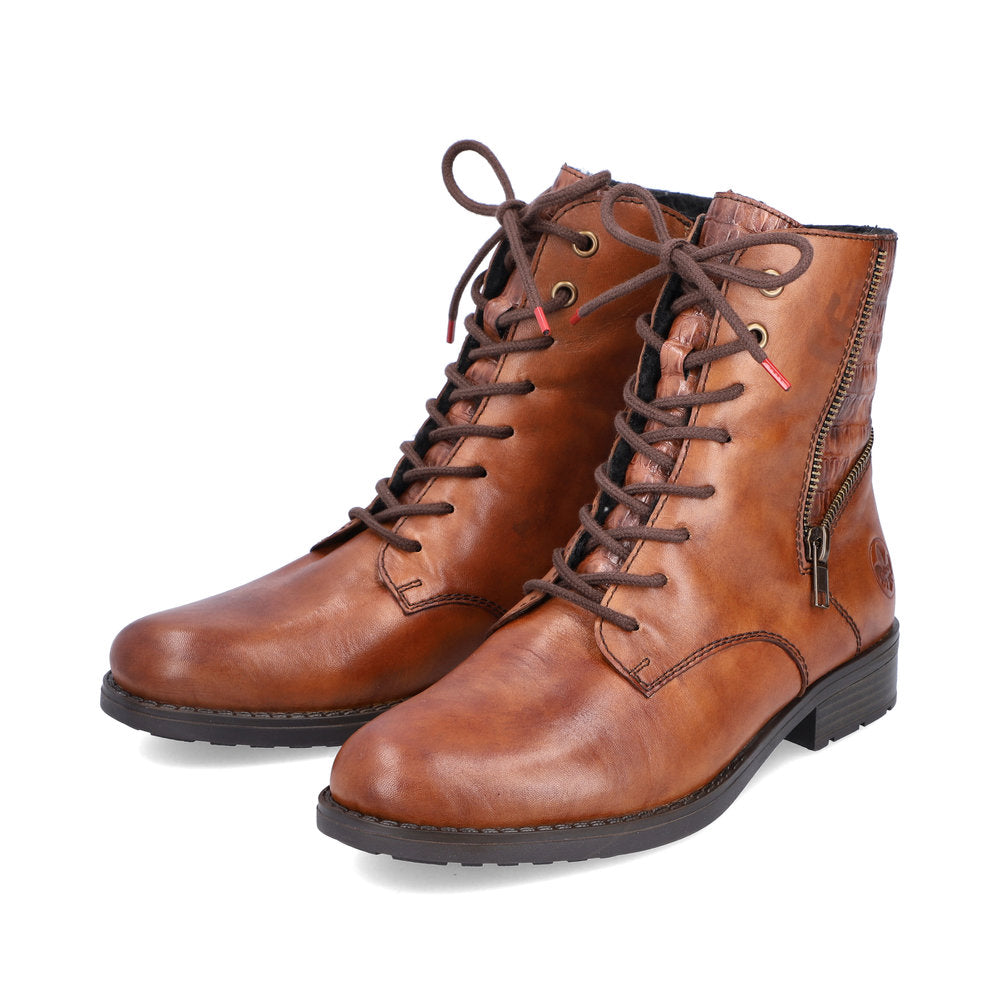 Smart tan leather lace up ankle boots with dressy low heel. These neat minimal boots look great with jeans or navy trousers for a smarter look.