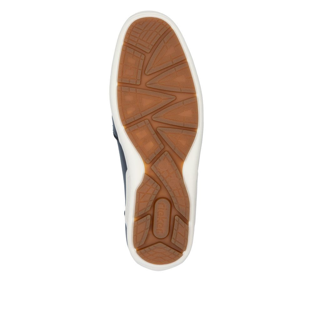 Rieker men's soft navy blue leather slip on driving shoes. These lightweight leather shoes are soft and breathable with an easy slip into design with two elastic gussets. The sole carries on up the back of the heel which makes this style ideal for driving.