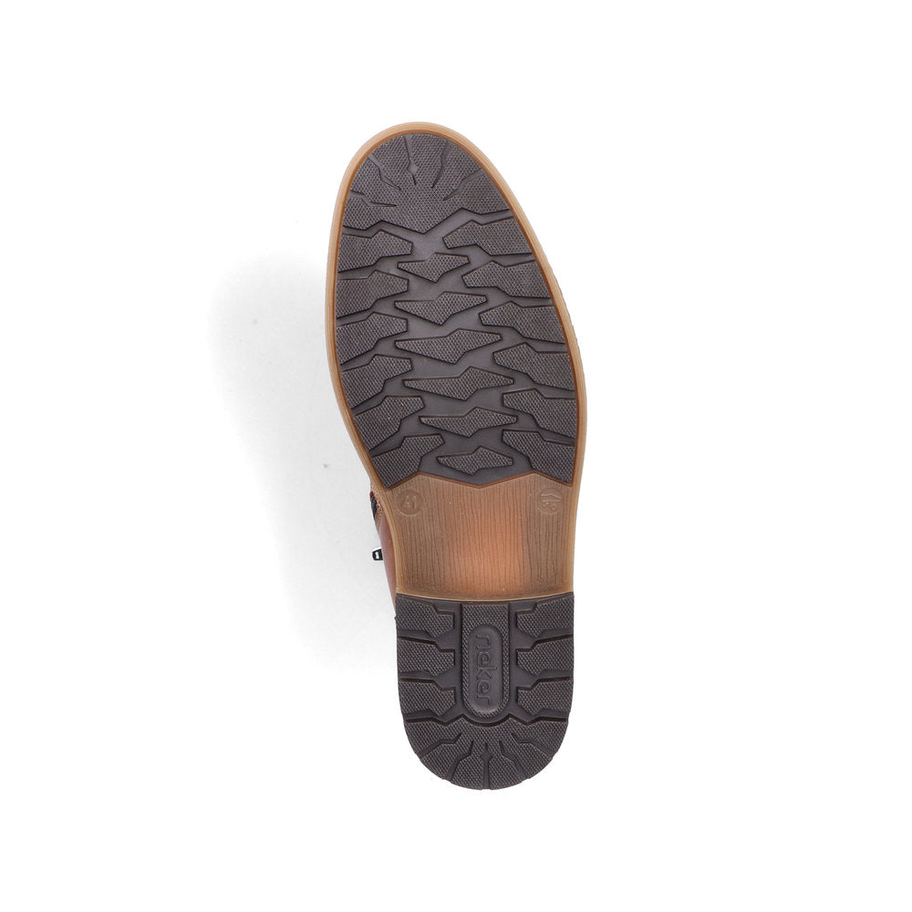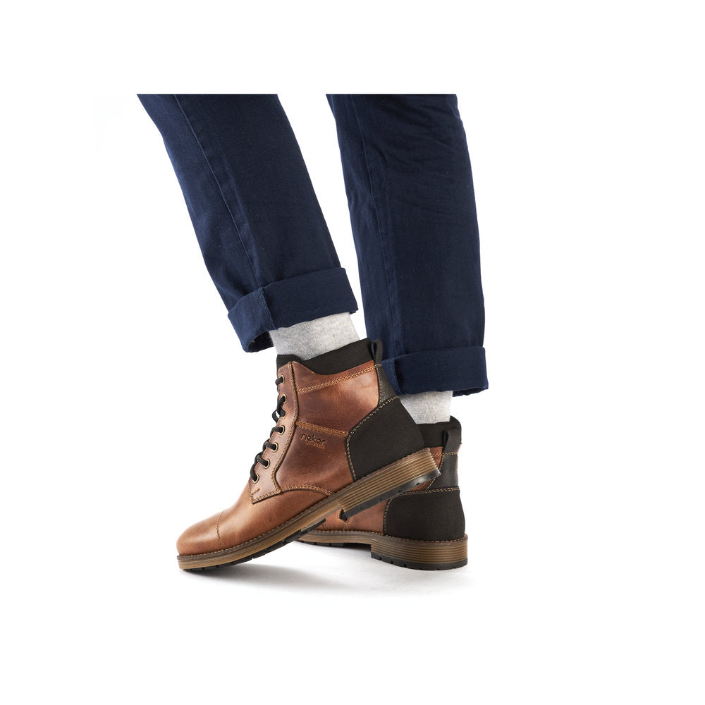 Rieker men's tan smooth leather with dark brown heel detail, smart toecap style stitching line and cleated rubber sole for winter wear. These natural leather boots look great with jeans for a practical smart casual look.