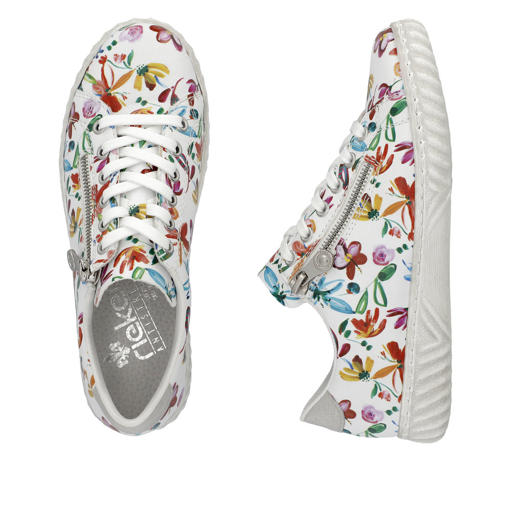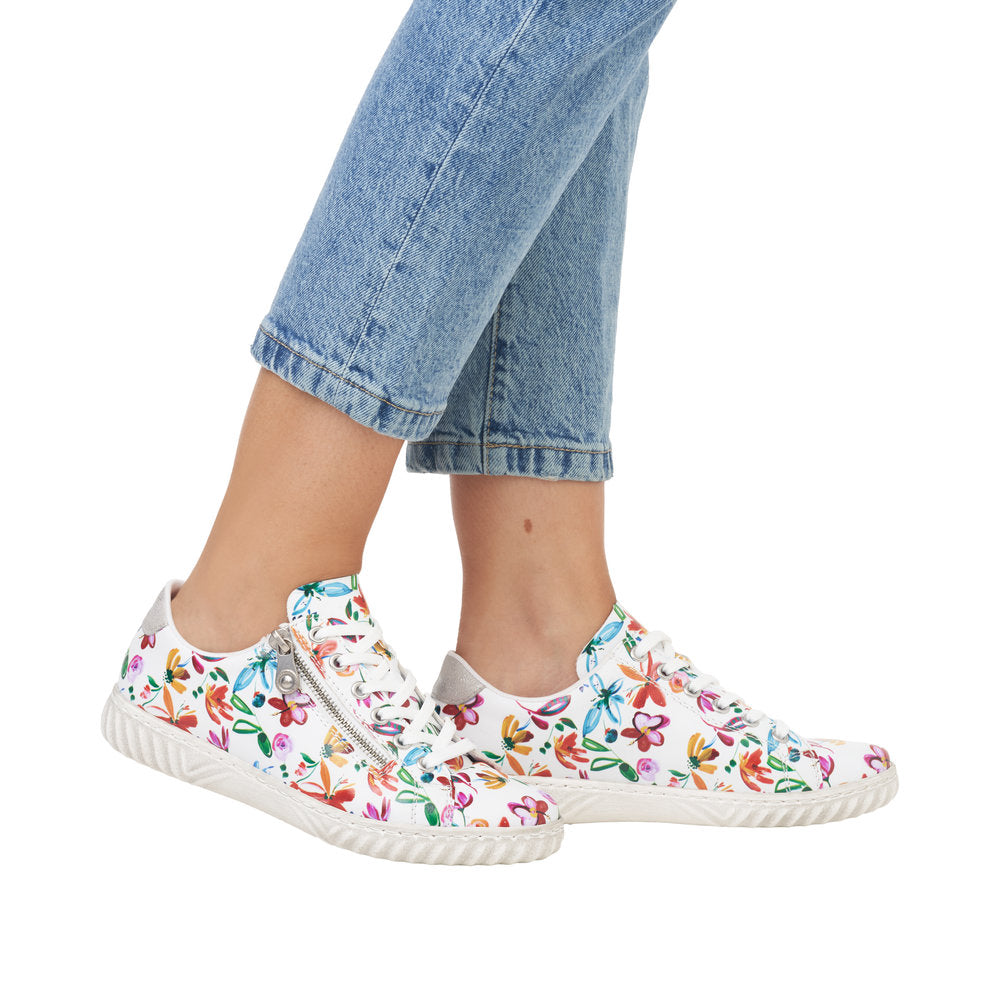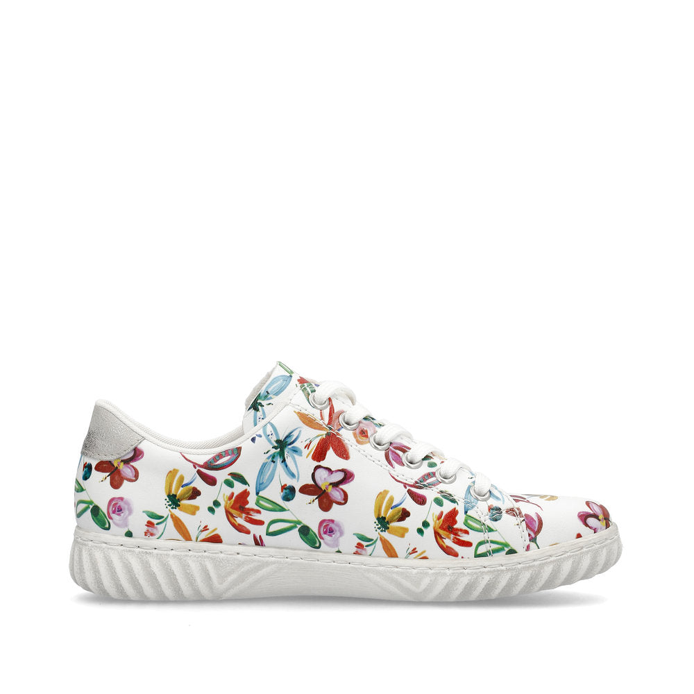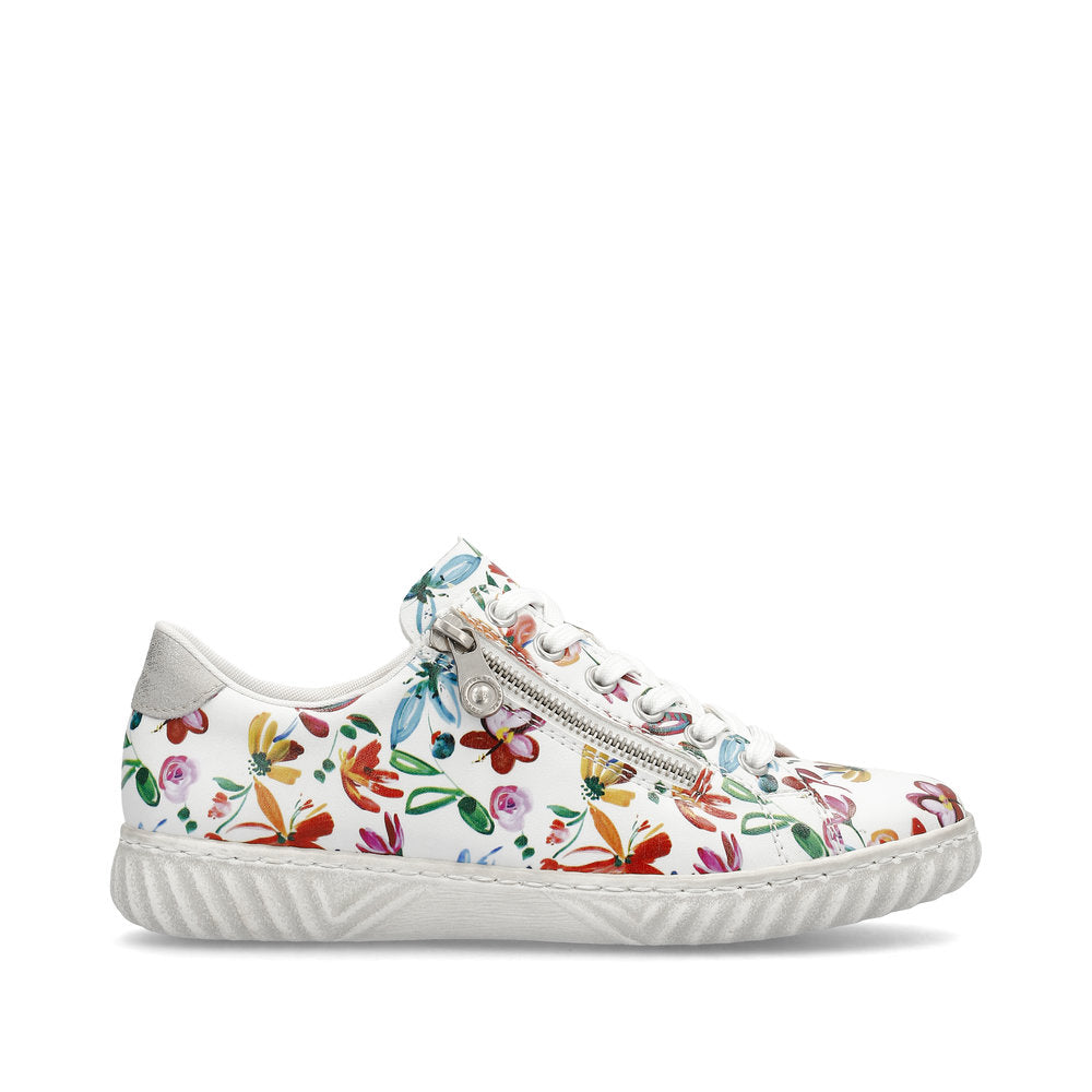 Fresh new light weight white multi sneakers with a textured white sole from Rieker. These understated soft synthetic sneakers feature a zip fastening for easy on/off .This is a delightful impressionistic floral print. Why not wear a work of art on your feet this summer!