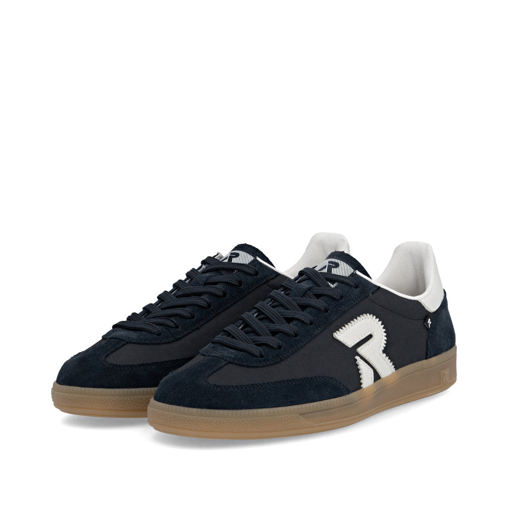 Rieker navy blue suede and leather combination sneaker with natural gum rubber sole. These neat everyday casual have a sleeker shape than a pair of trainers.