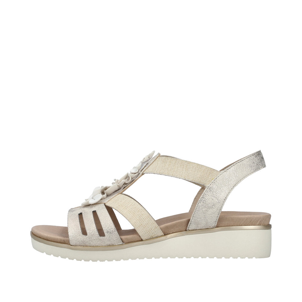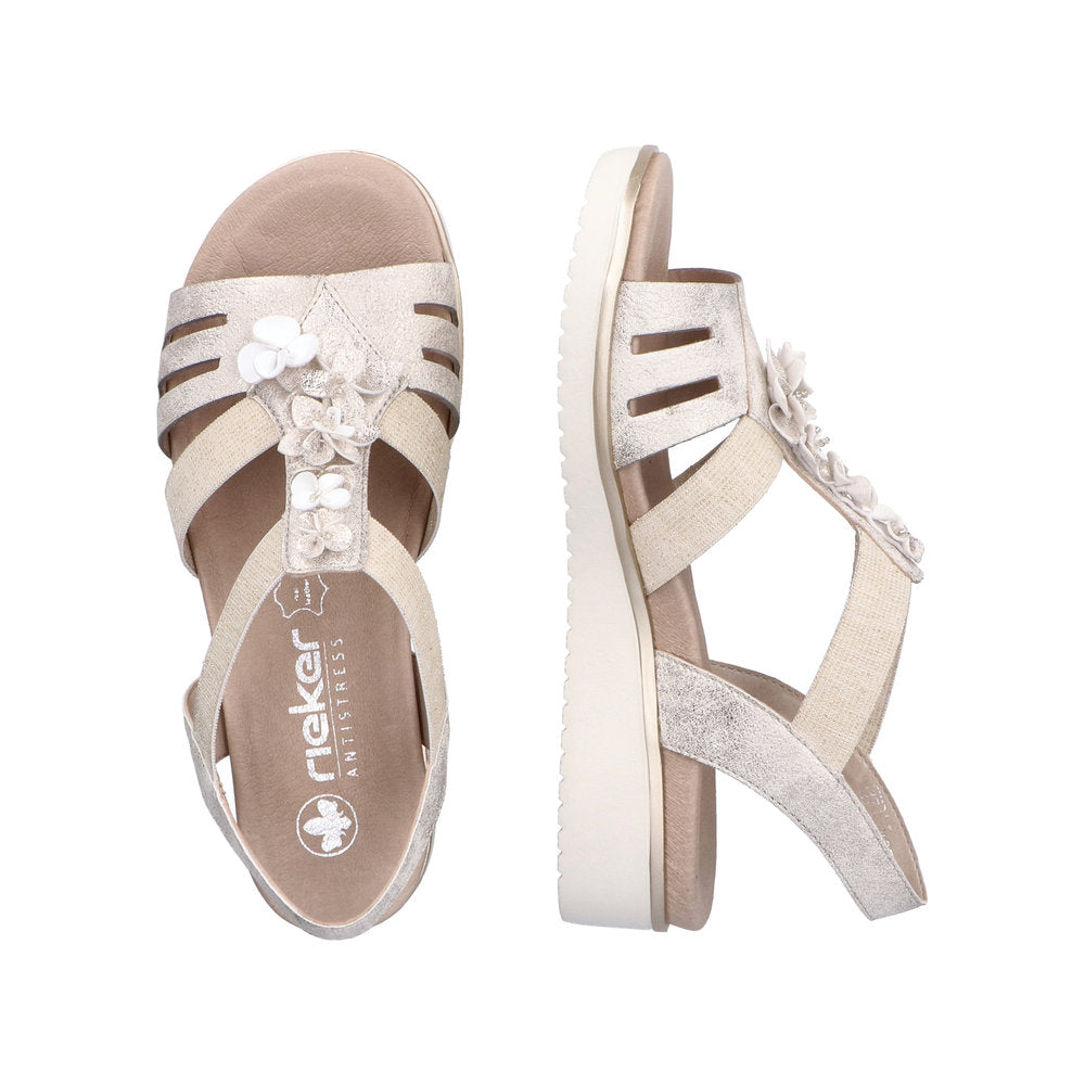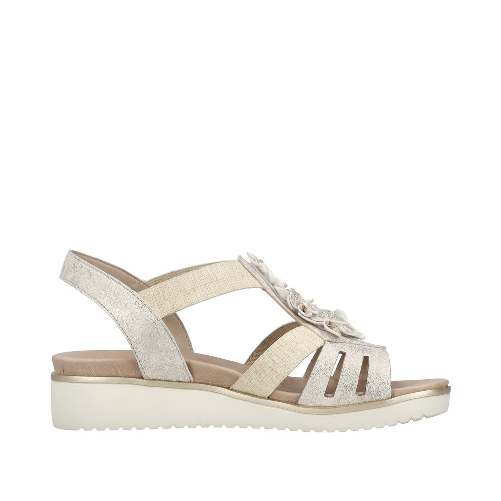 Rieker V3788 metallic pale gold and beige wedge heel slip-on sandals with colour matching platform sole. These comfy walking sandals add a bit of zing to an outfit with a subtle metallic sheen upper and pretty 3D flower detail central panel and gold lurex elastic straps.