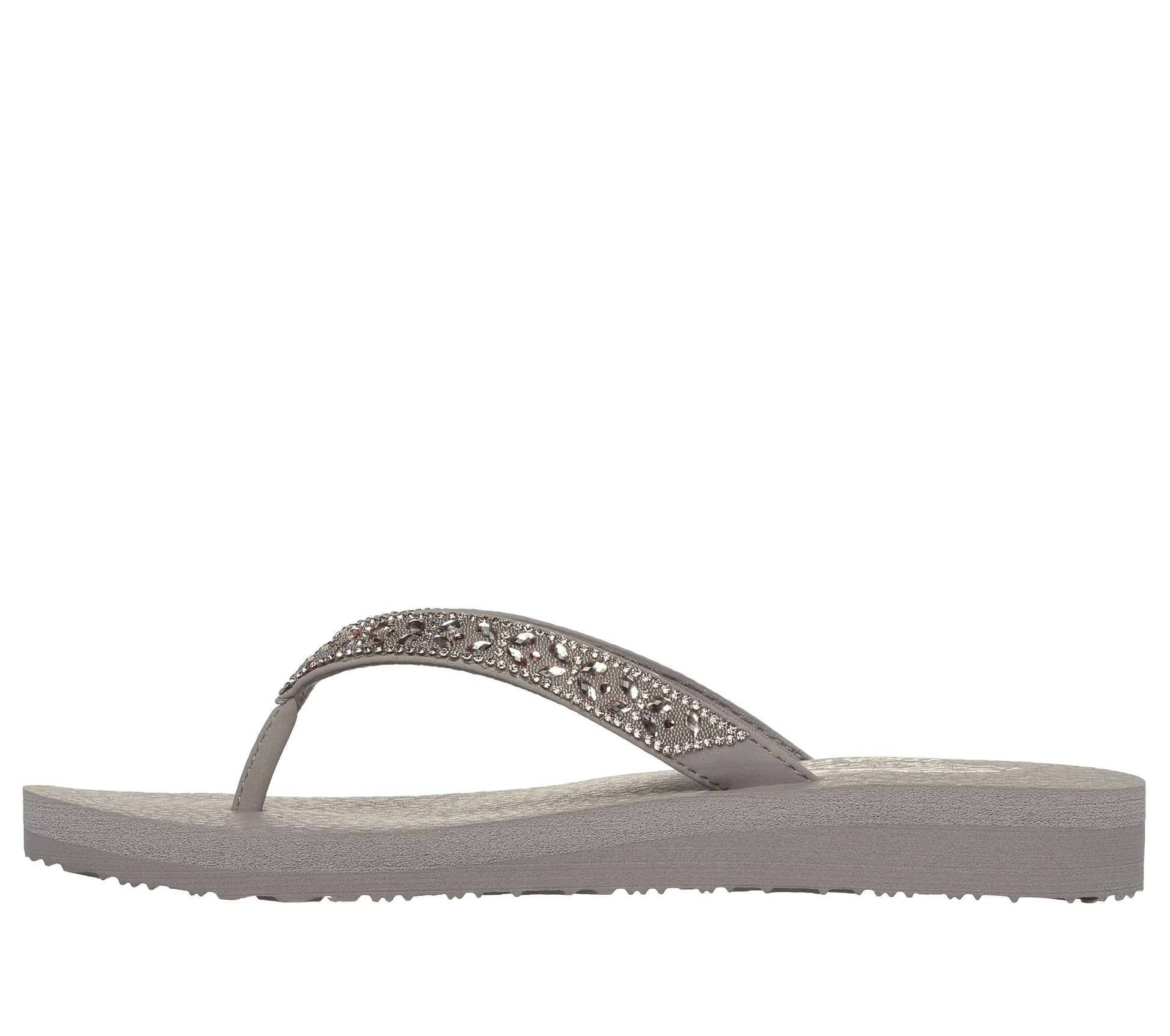 Glam up in style this season wearing Skechers Cali® Meditation - Butterfly Garden. This casual vegan thong sandal features a three-point synthetic upper with butterfly gem detail and a cushioned Yoga Foam® comfort footbed.