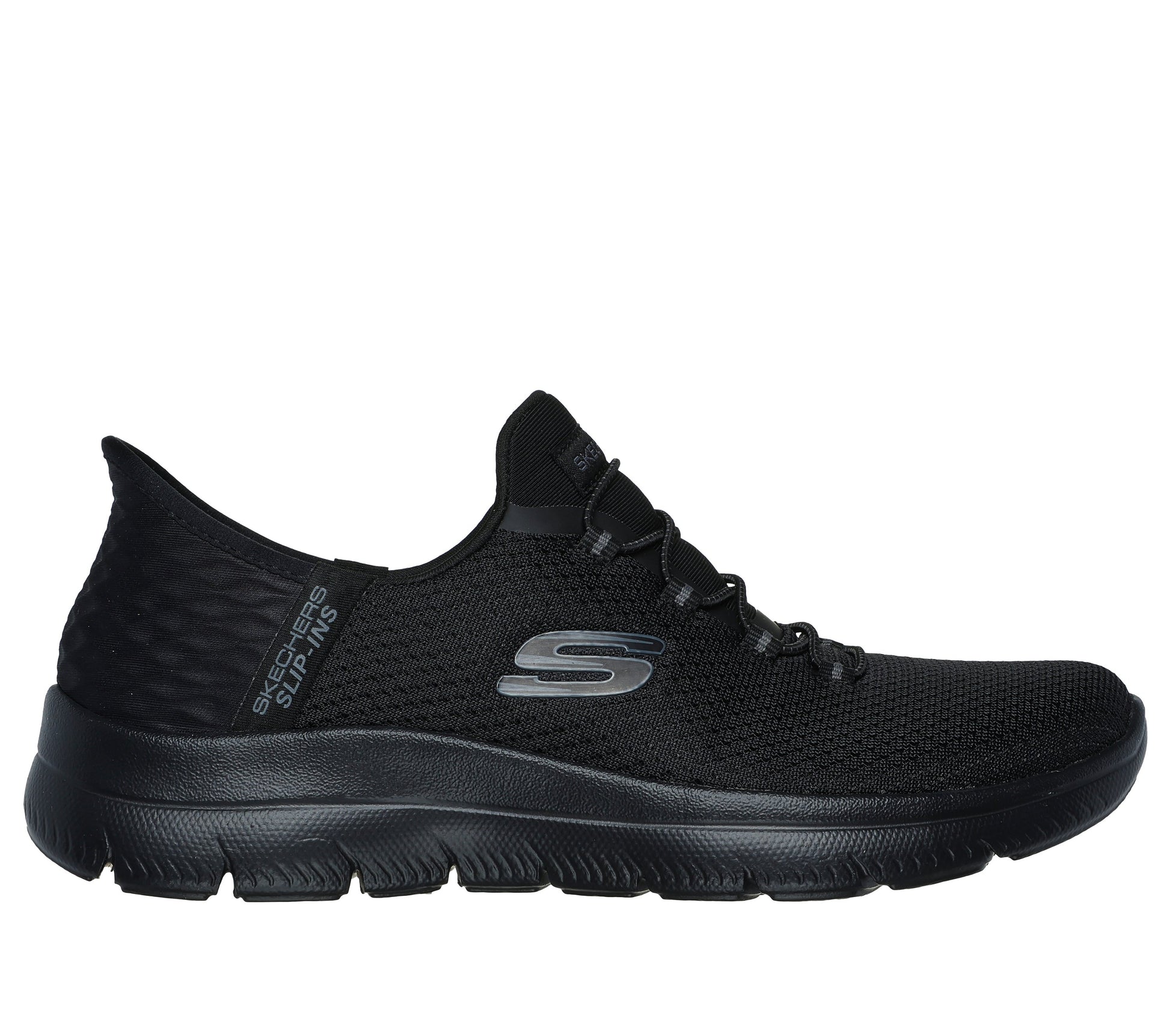 Pick up the pace with increased ease-of-wear and platinum comfort wearing Skechers Hands Free Slip-ins®: Summits - Diamond Dream. Designed with our exclusive Heel Pillow™, this vegan style features a mesh upper with stretch laces, metallic midsole trim and a cushioned Skechers Air-Cooled Memory Foam® comfort insole.