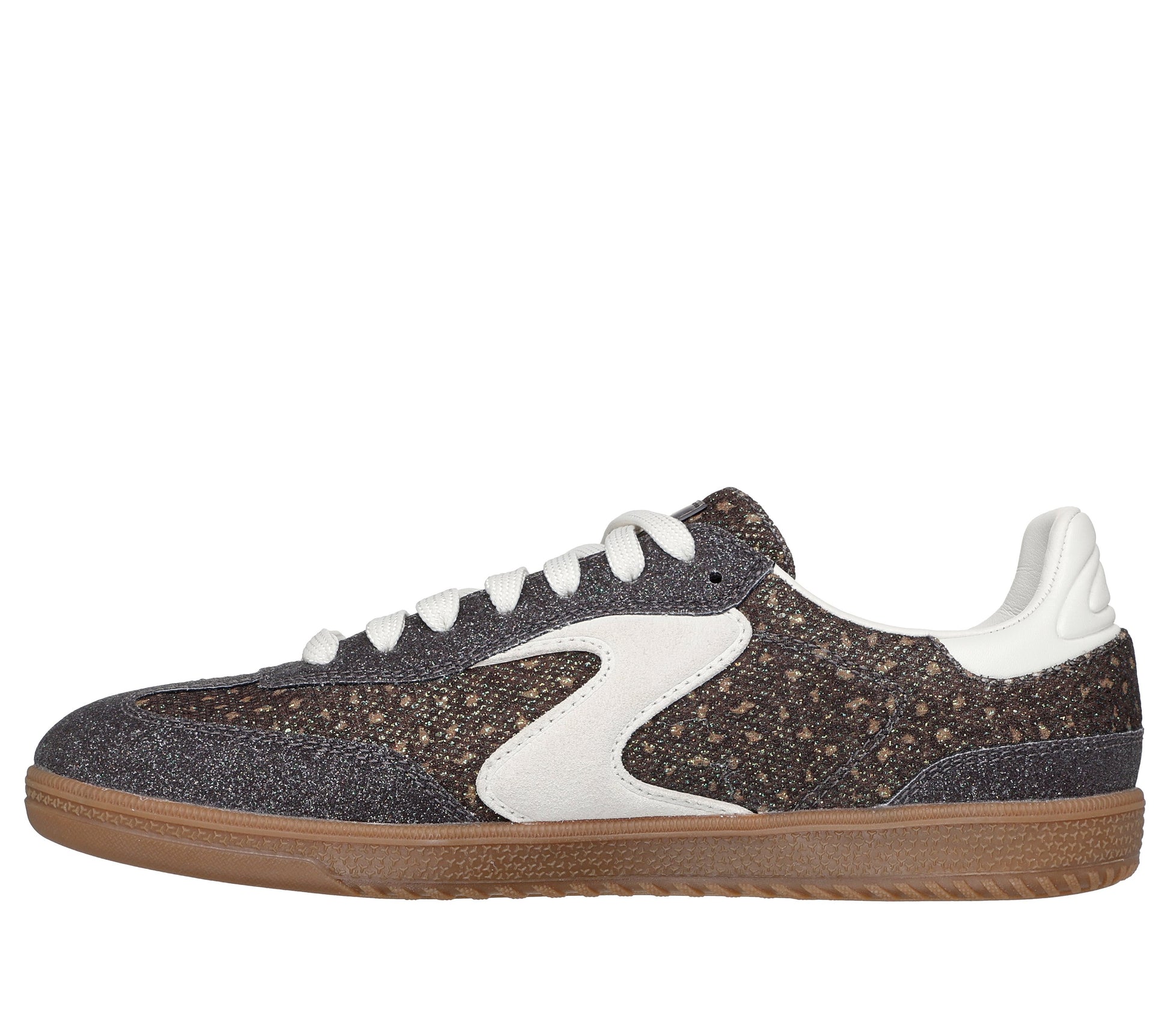 - Glitter mesh upper with leopard print and solid-color overlays