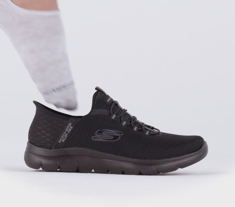 Step into easy-wearing comfort with Skechers Hands Free Slip-ins®: Summits - High Range. Along with our Exclusive Heel Pillow™ that holds your foot securely in place, this vegan style features a unique Skechers Slip-ins® molded heel panel, a mesh upper with fixed laces, and a cushioned Skechers Air-Cooled Memory Foam® insole.