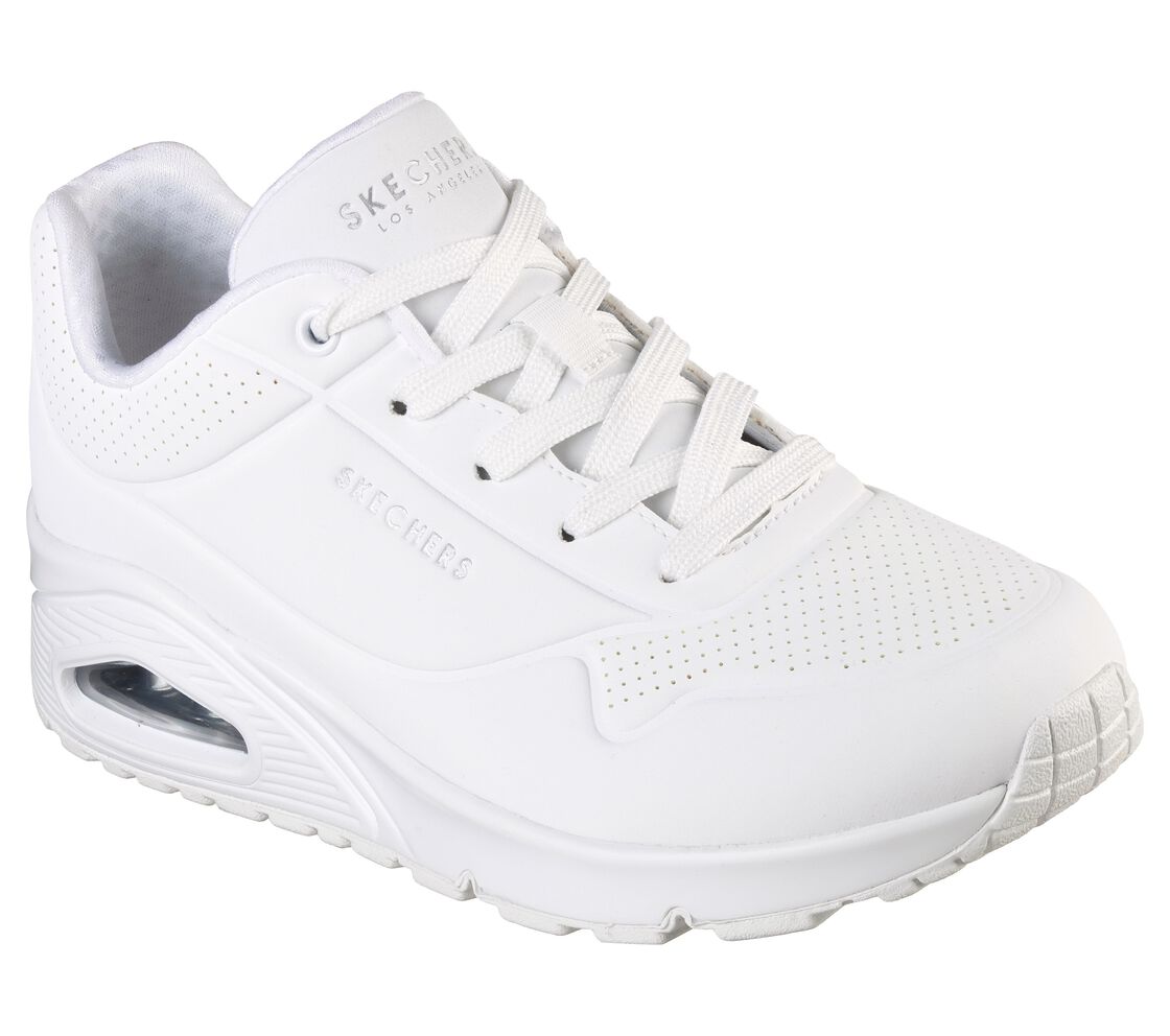 Classic air cushioned style meets updated comfort in the SKECHER Street Uno - Stand on Air shoe. Smooth textured synthetic upper in a lace up classic fashion sneaker with stitching and perforation accents. Air Cooled Memory Foam insole, visible air cushioned midsole.