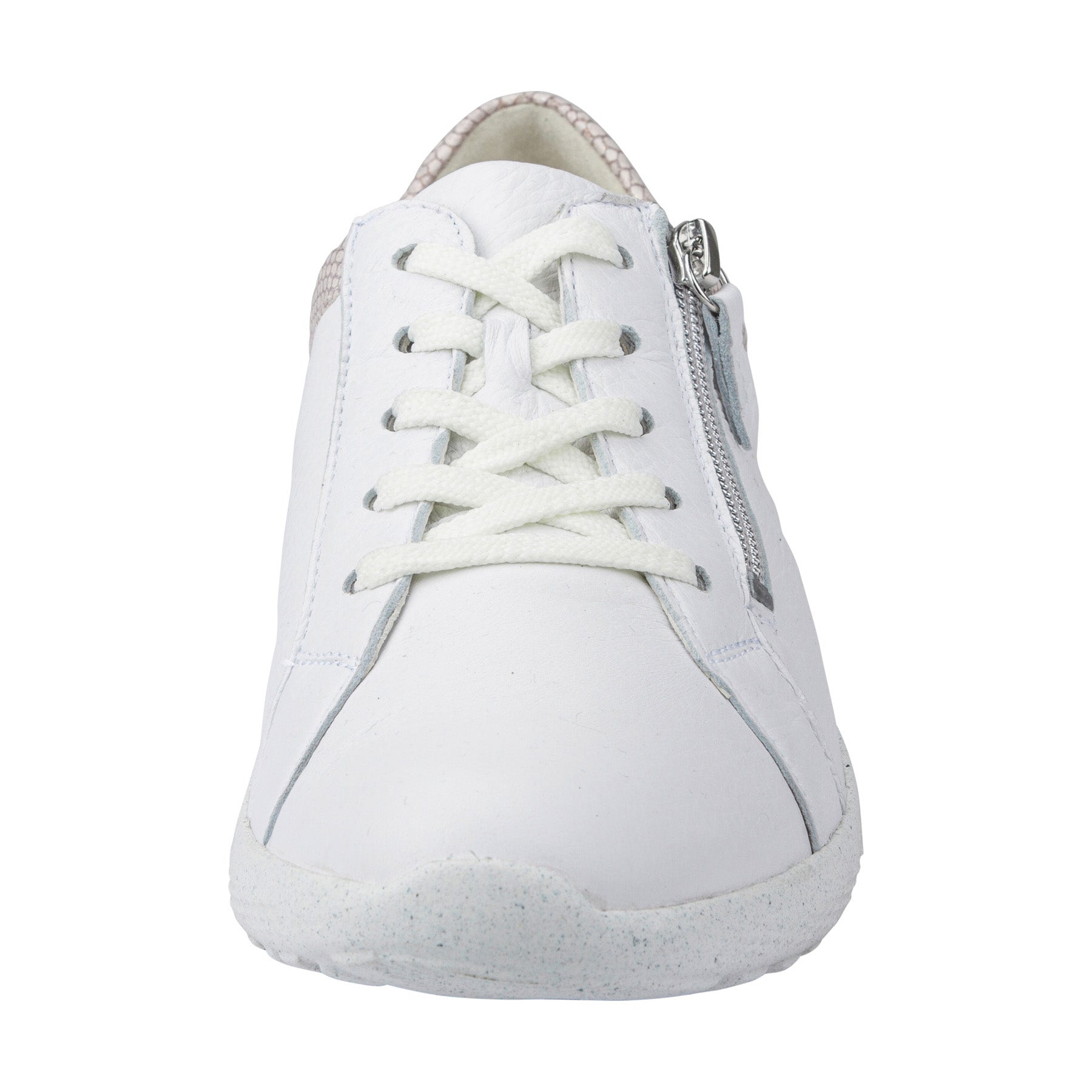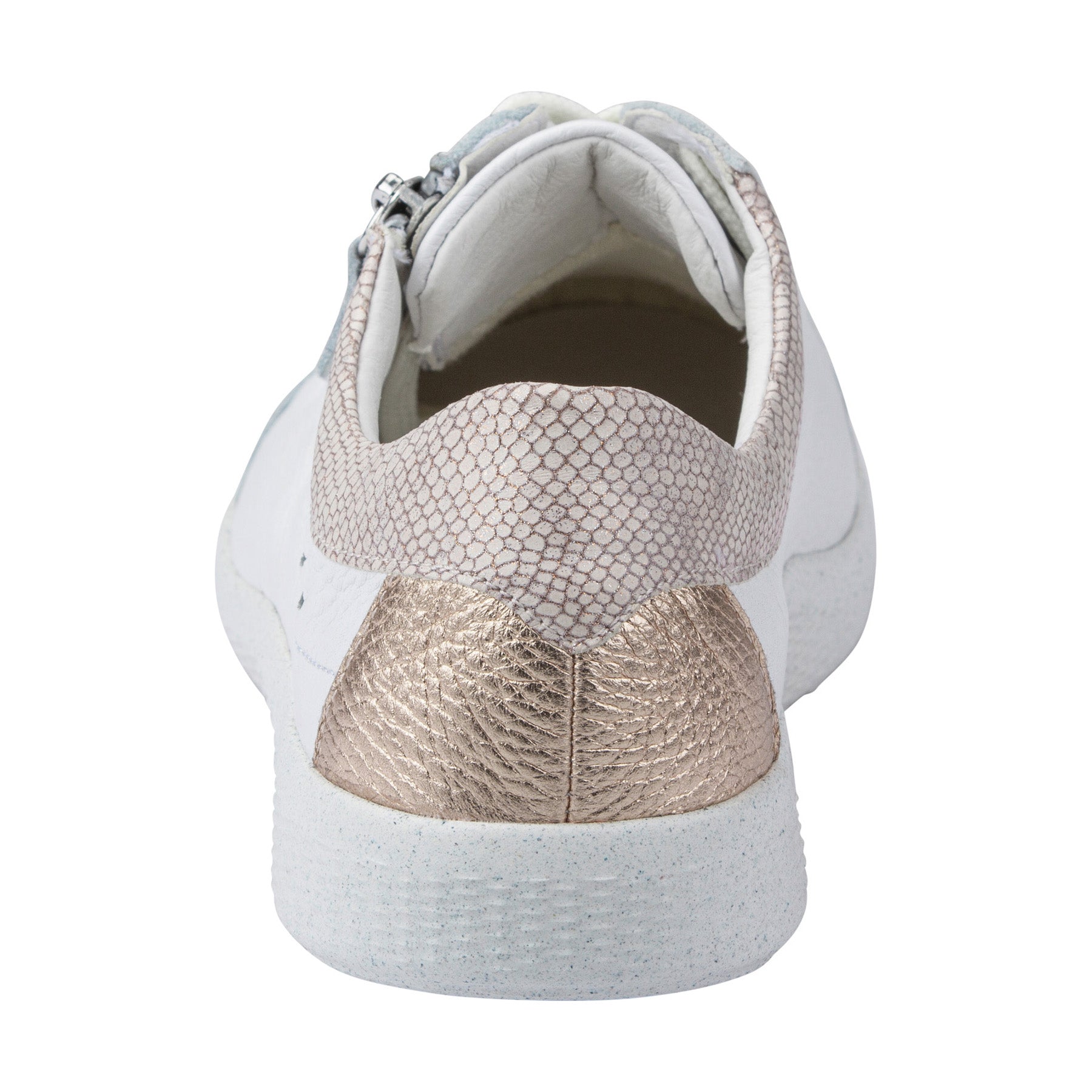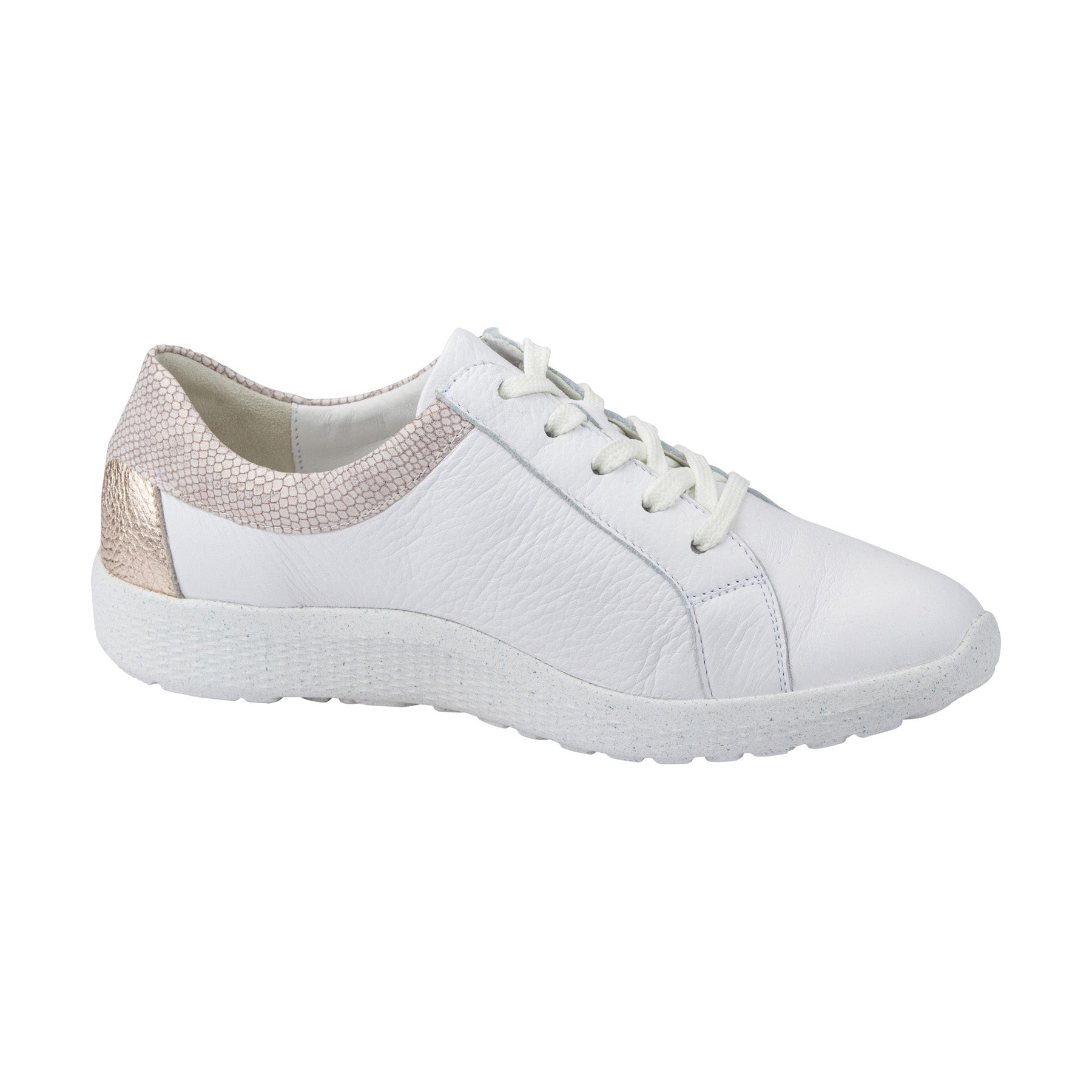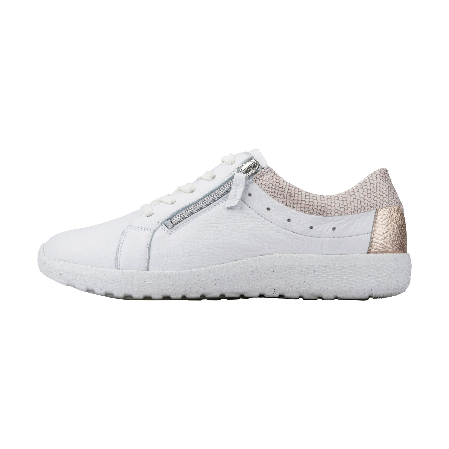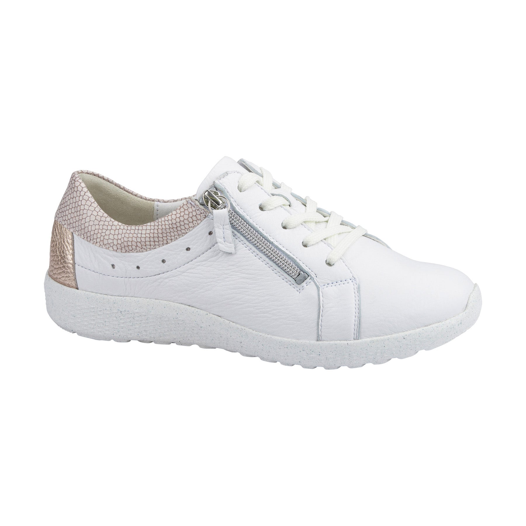 Ira extra wide fit trainers with ultra light weight sole and adjustable lace and zip fastening. Photos don't do this product justice. This is an exceptionally soft and comfortable leather shoe which looks great with a summer dress or cut off trousers. The rose gold detail on the heel trim makes these shoes just that little bit smarter than your average pair of leather trainers. K-Ira is made from a super soft deer skin leather, meaning this shoes requires no breaking in, it's just instant comfort. K fit shoes have a deeper toe box than Waldlaufer H fit shoes.
