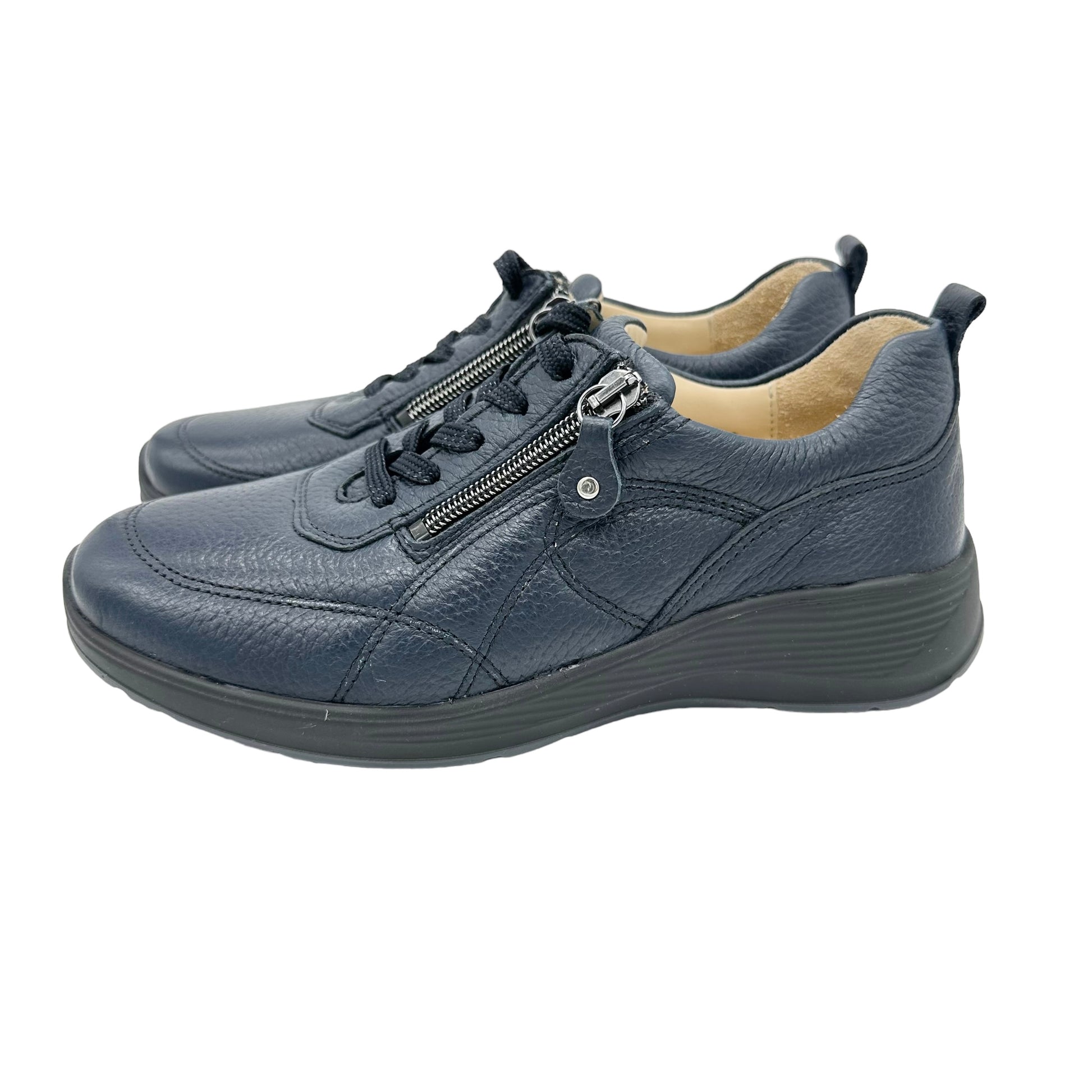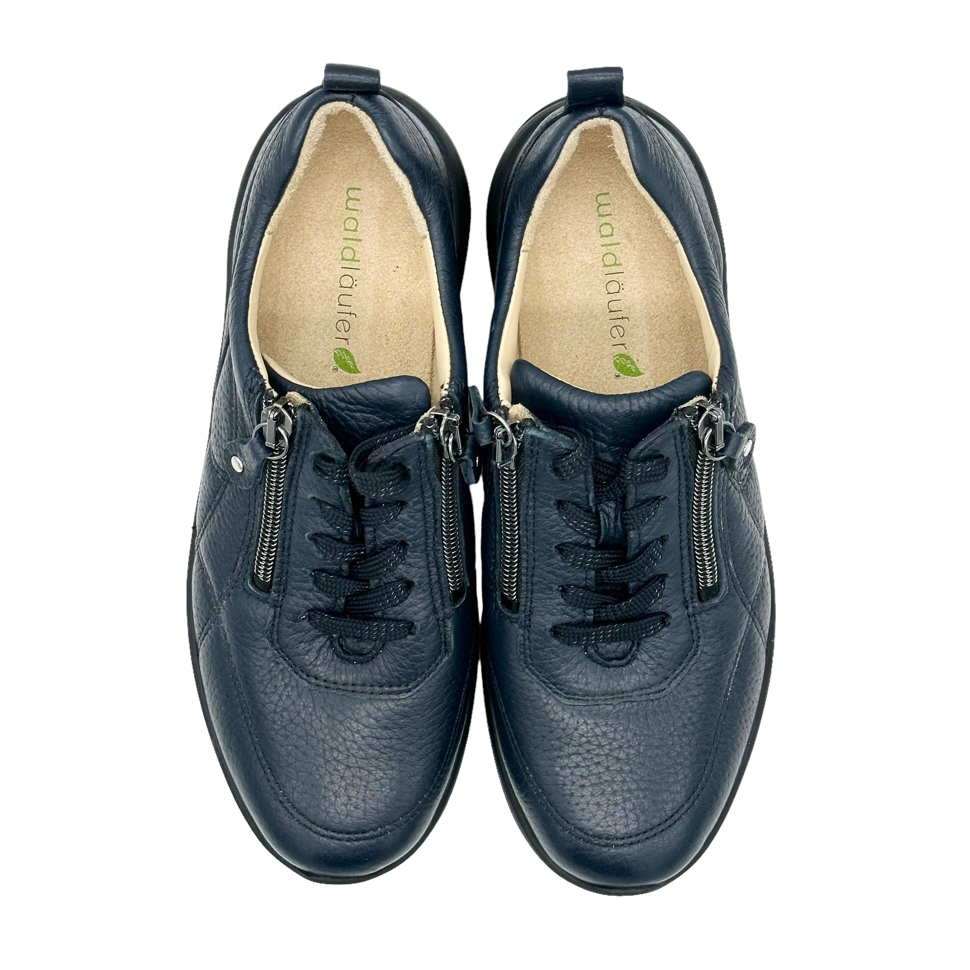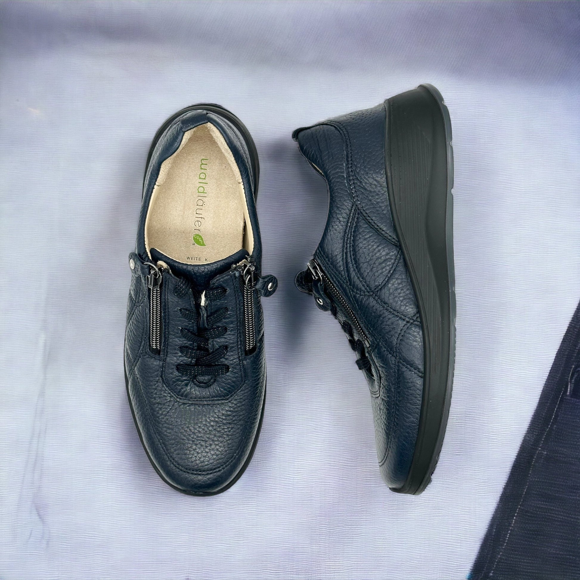 Kalea wide fit trainers with light weight wedge heel and sole with adjustable lace and dual zip fastening. Waldlaufer extra wide K fit Kalea is made with leather that is supple and soft so that it moves with your foot. K fit shoes are slightly deeper than Waldlaufer H fit shoes.