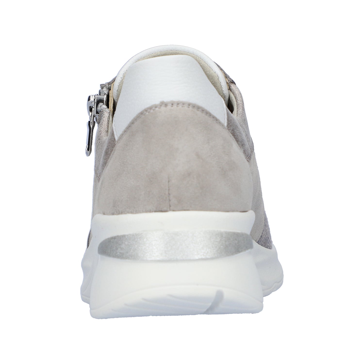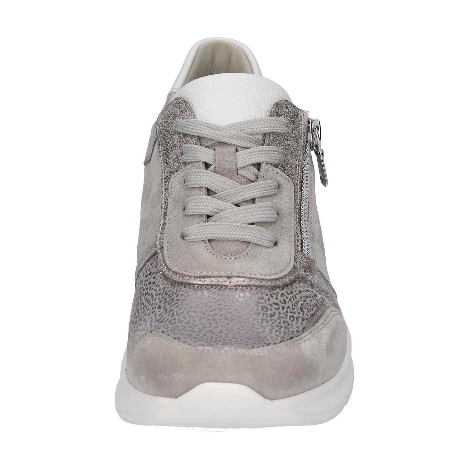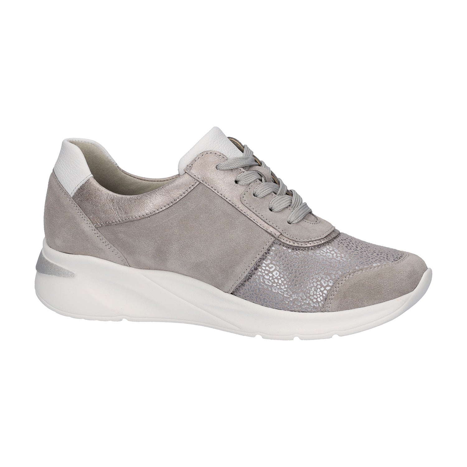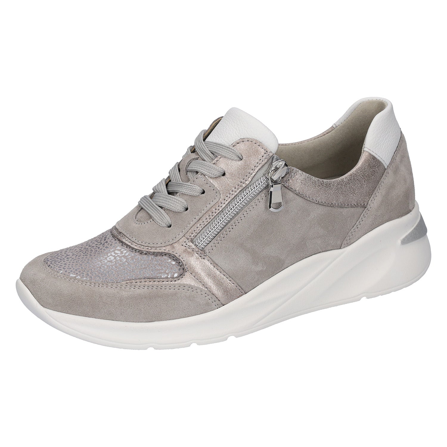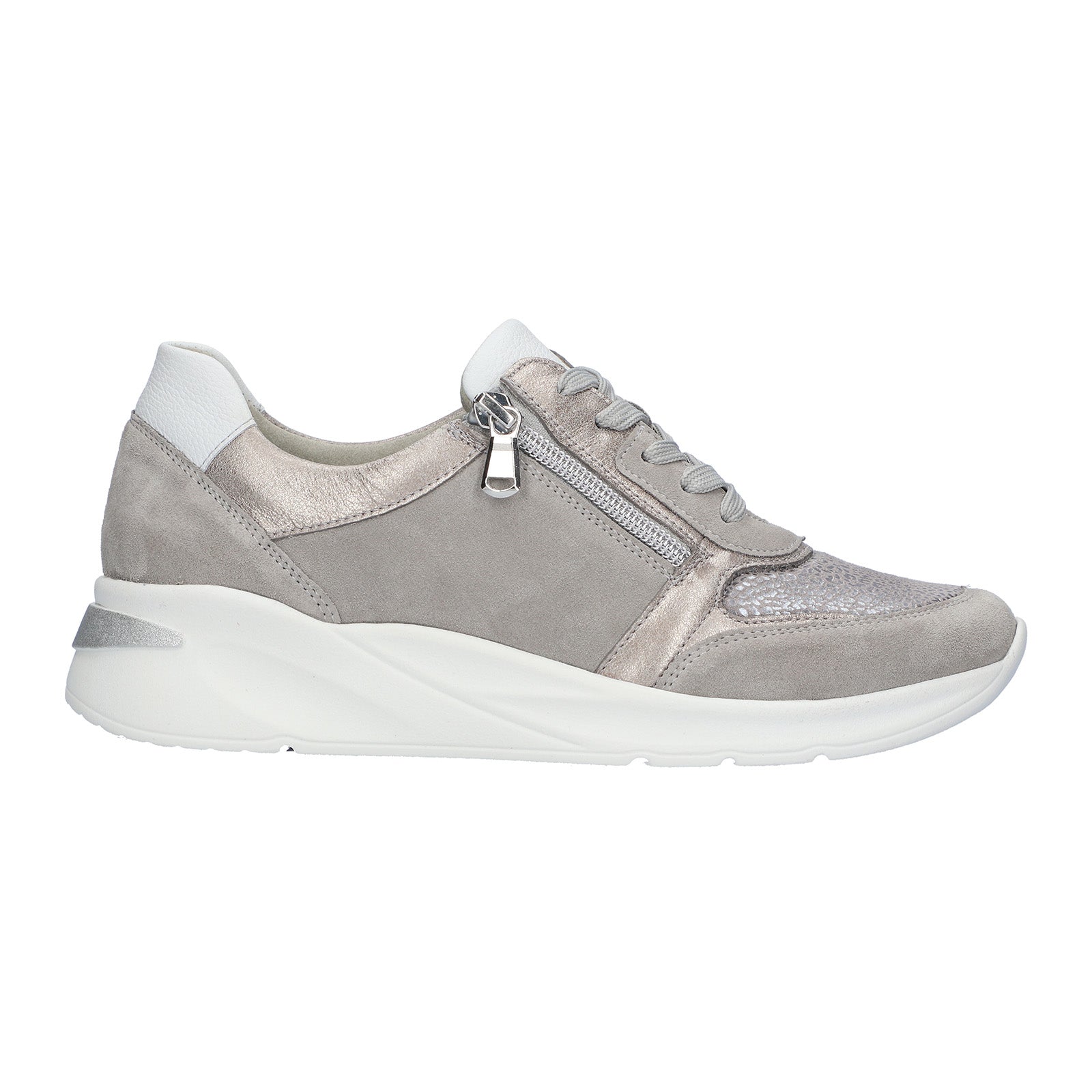 Waldlaufer Dilara trainers in super soft pale grey suede, metallic leather and stretchy fabric are an Extra Wide fit. Dilara has a side zip as well as lacing to accommodate getting the shoes on and off easily. This model works well with orthotic insoles, as you can remove the original in order to put your tailor made one inside. The soft silvery/pale gold leather and grey suede with white trim is on trend for summer and will tone in with all your holiday clothes. This shoe has a soft stretch front panel which accommodates different shaped feet easily without pressure.