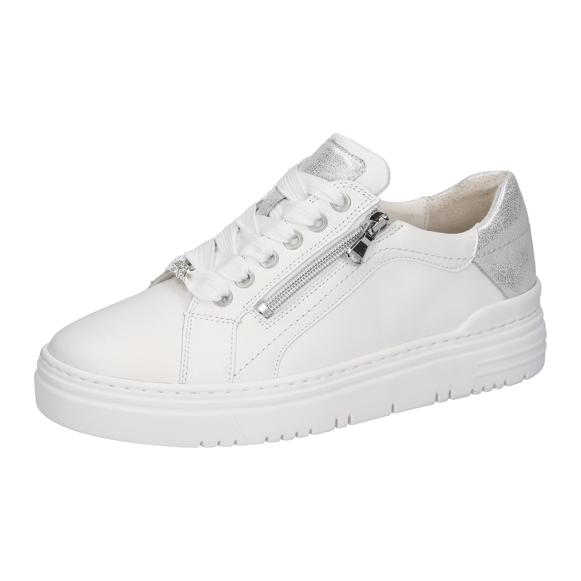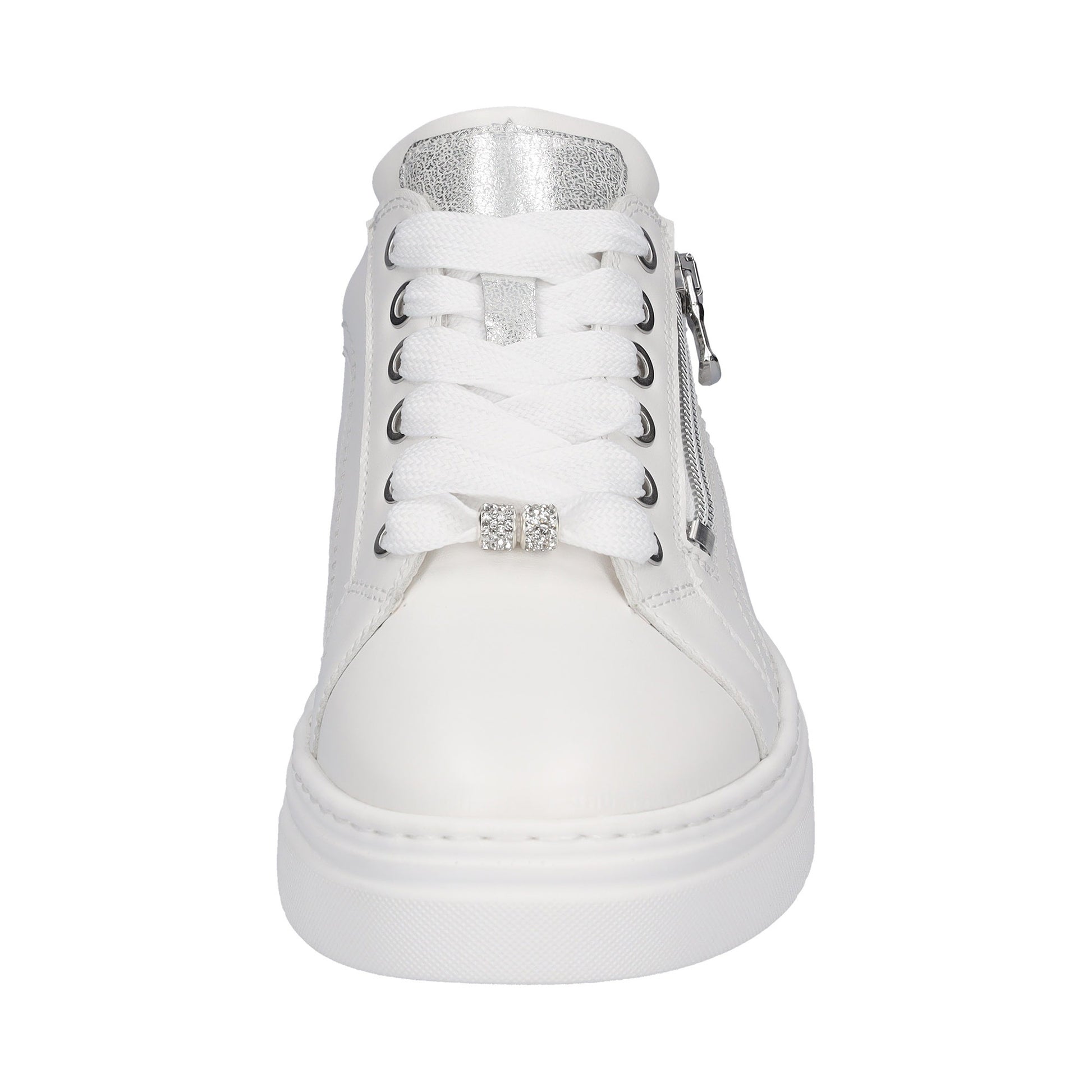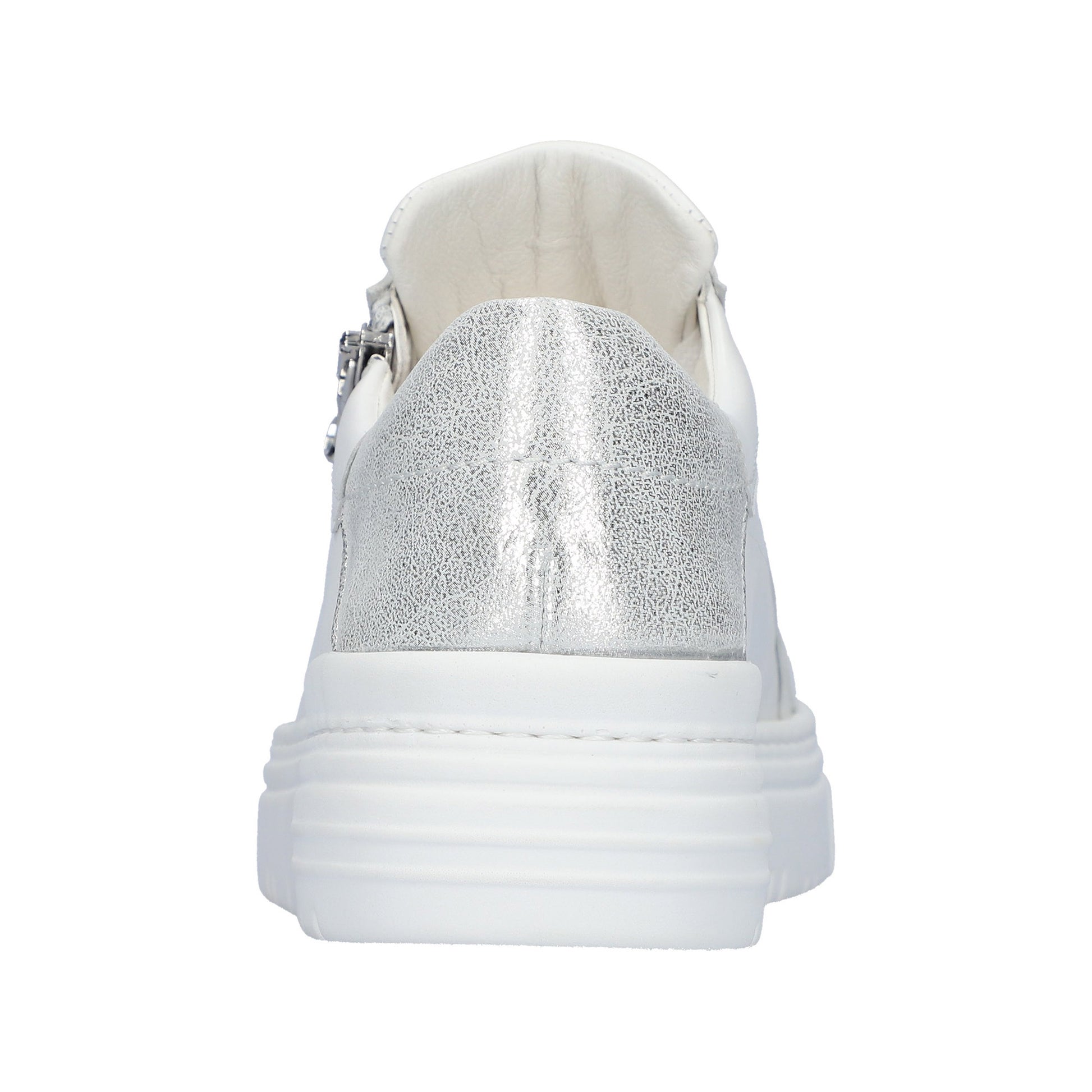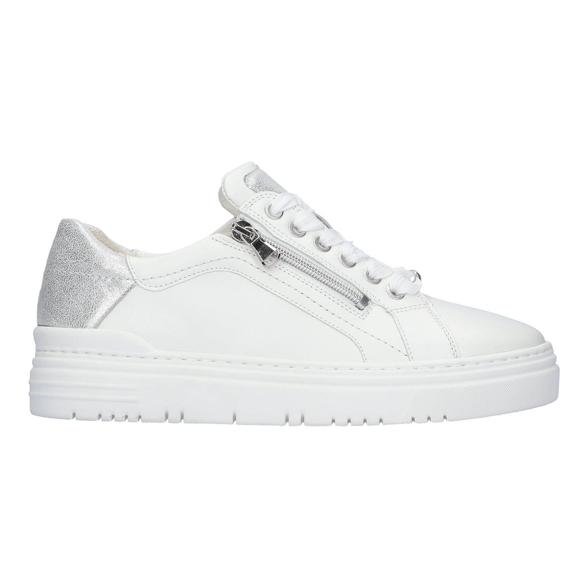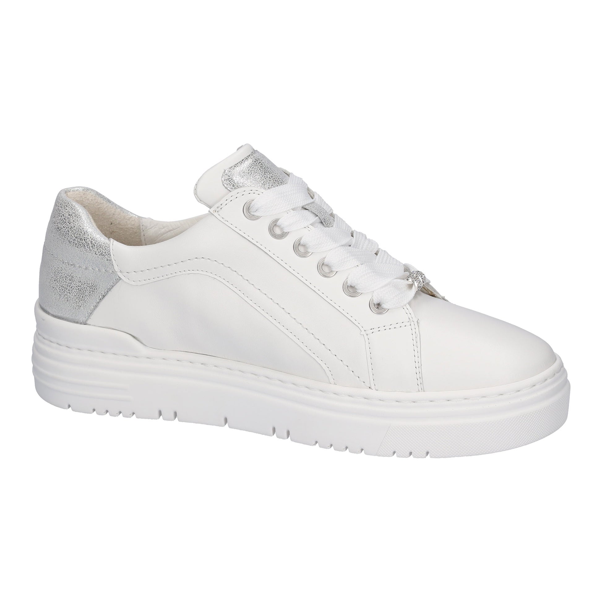 Soft white leather sneakers with silver accents. These dressy, wide fitting sneakers have a 1.5 inch platform sole for a smarter look and diamante charm detail which ties in beautifully with the silver metallic trim.