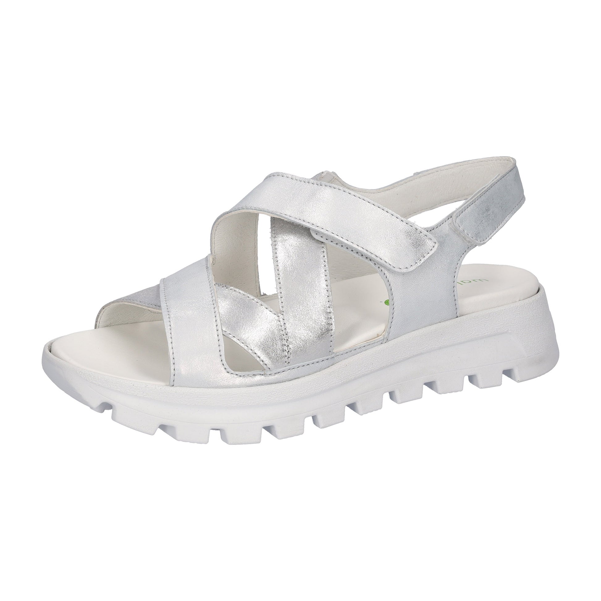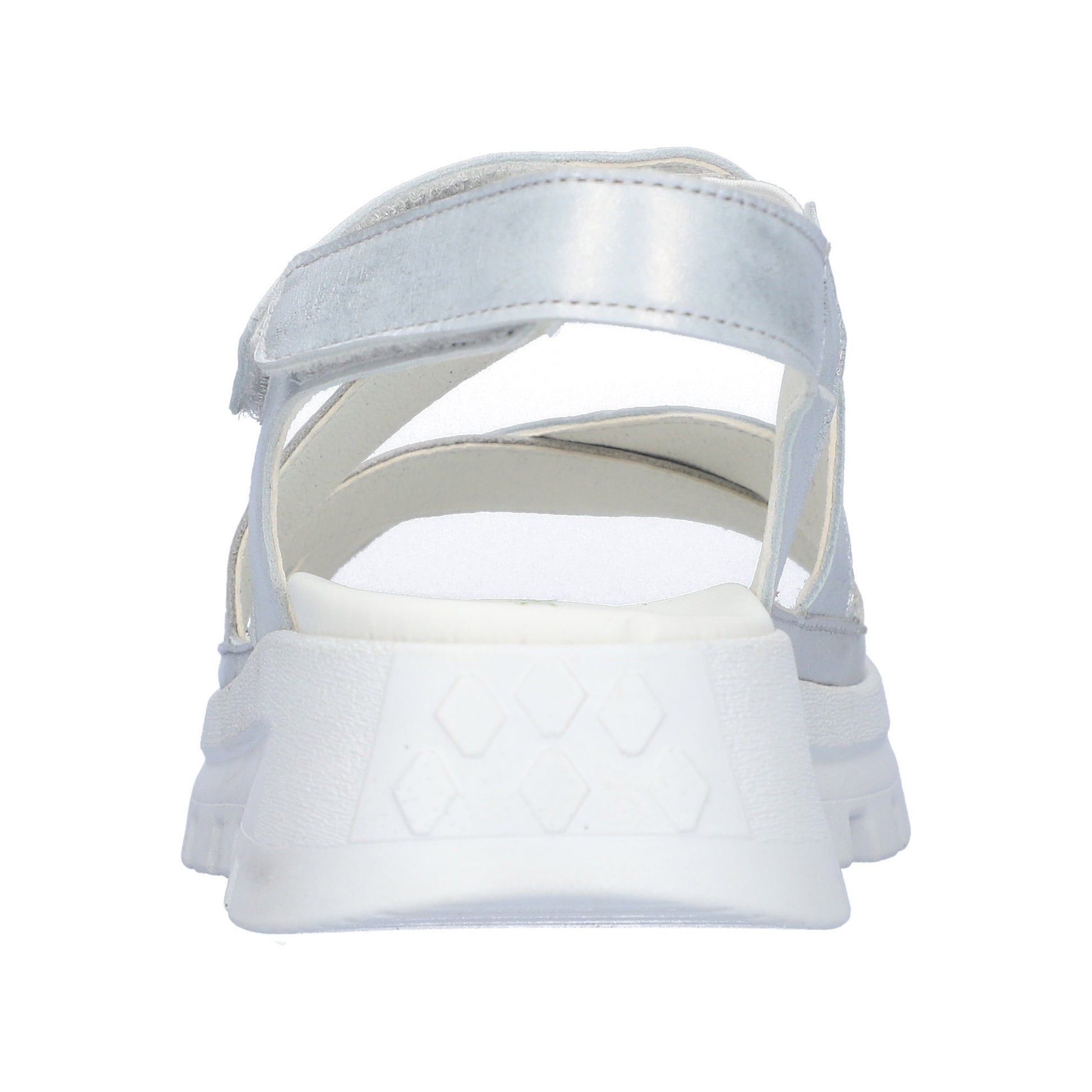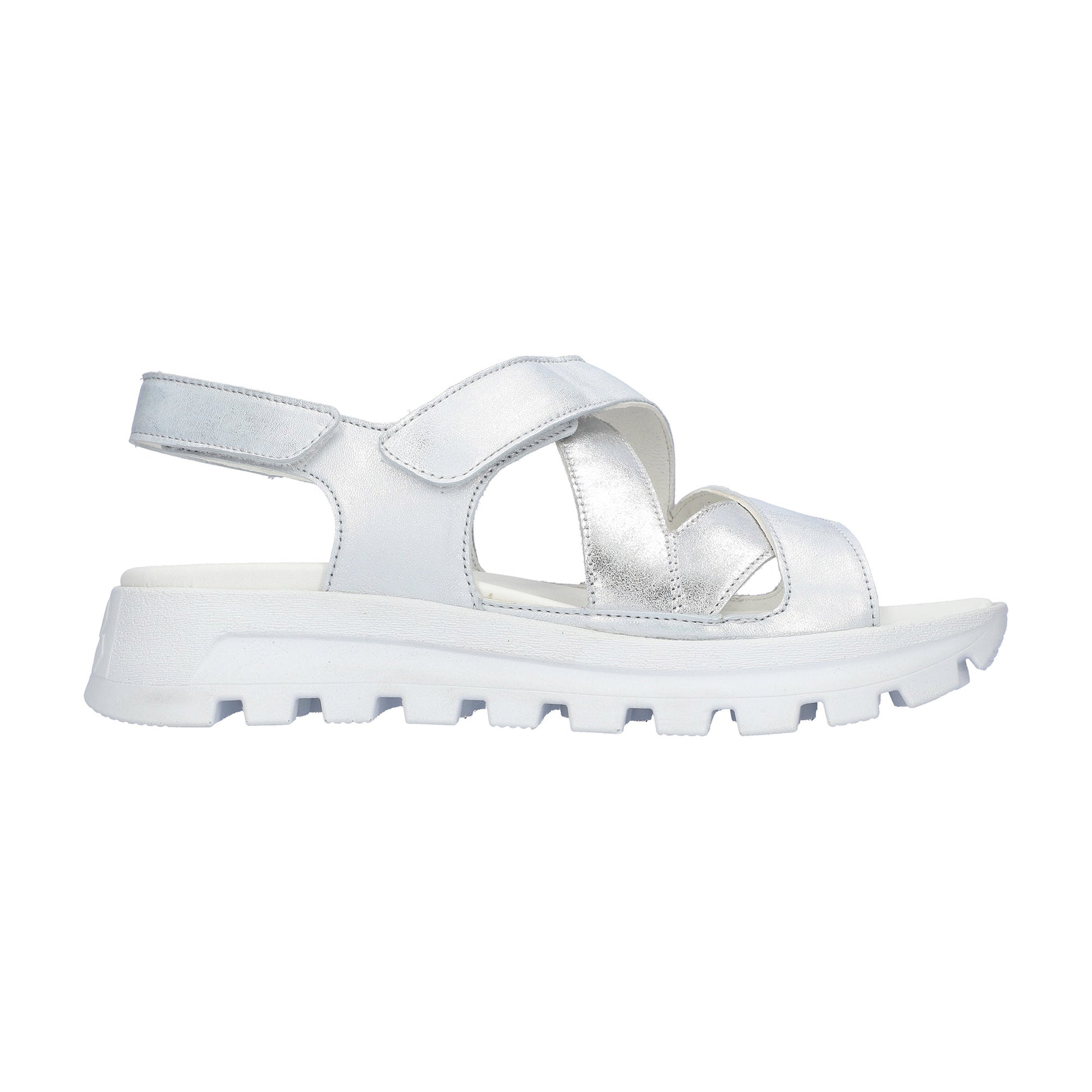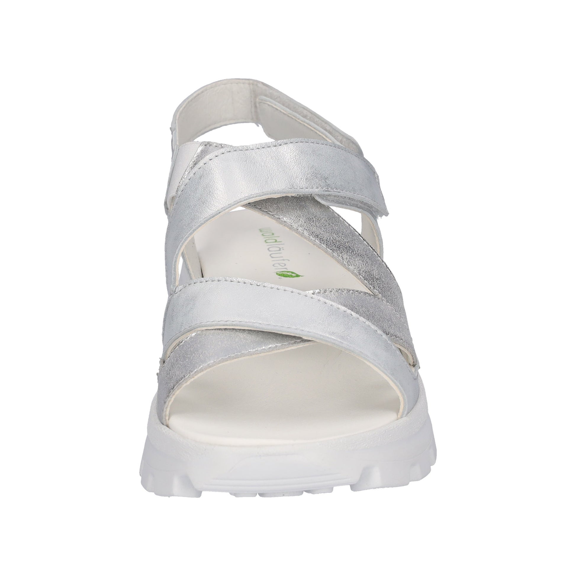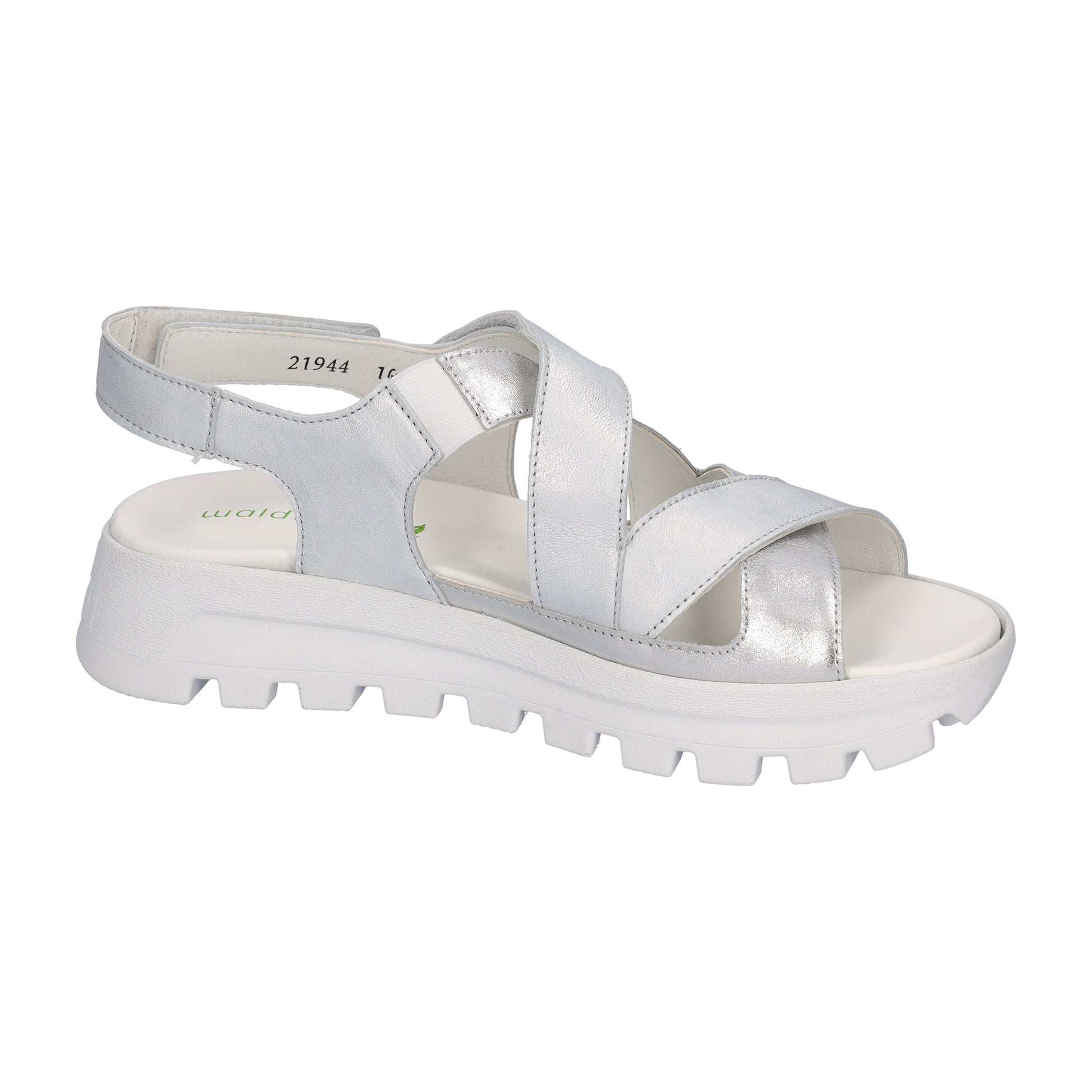 Waldlaufer two tone super soft silver leather sandals with full leather lining. These funky sandals have a lightweight chunky sole and an adjustable velcro fastening for a secure and supportive fit.