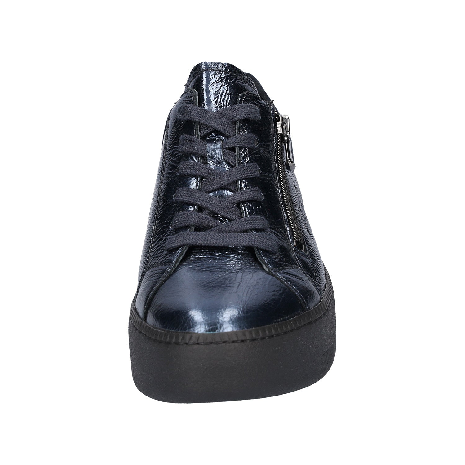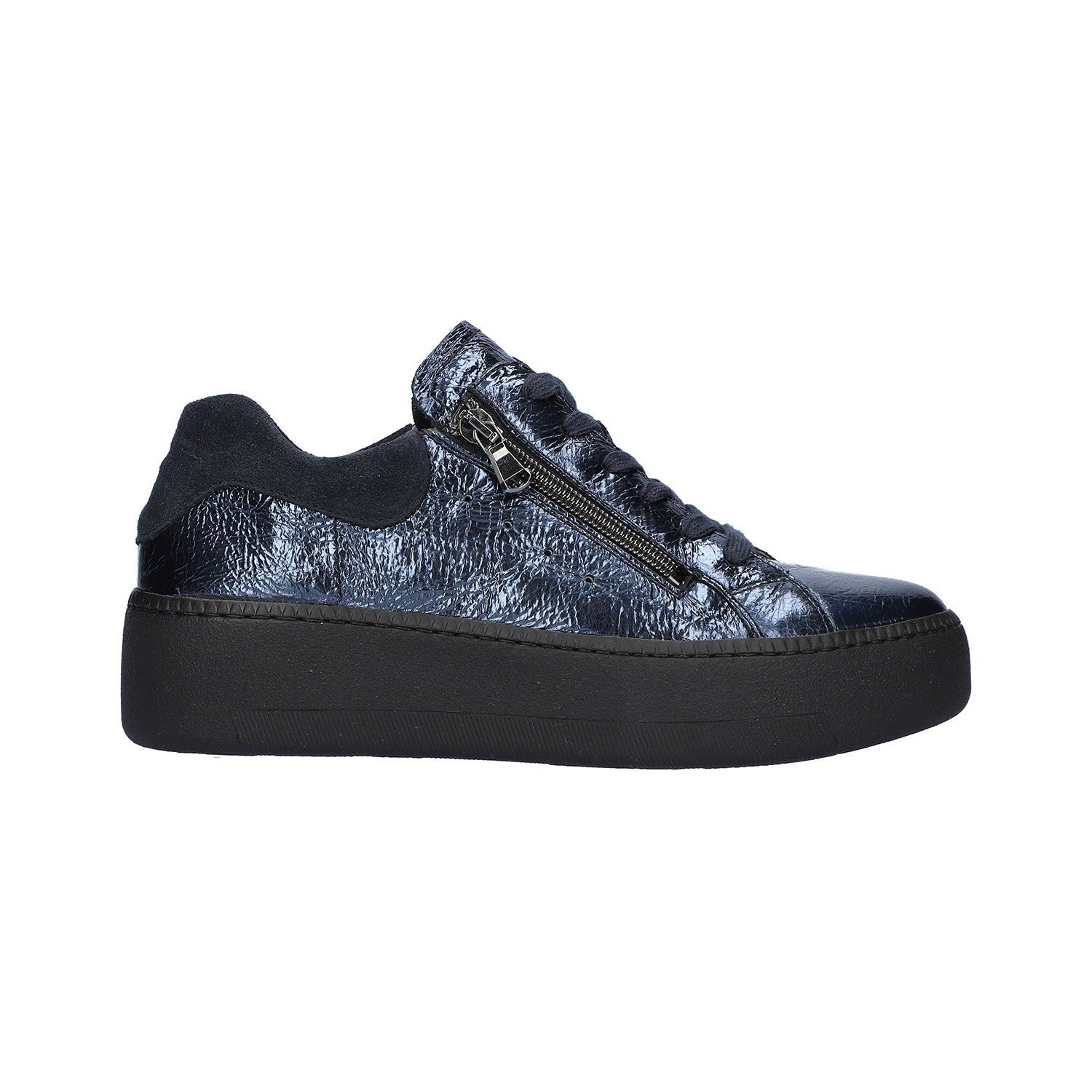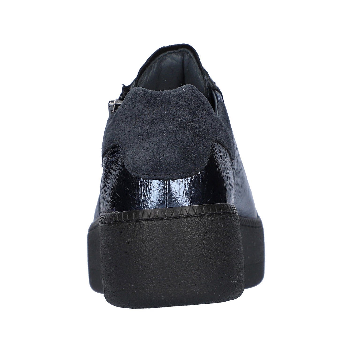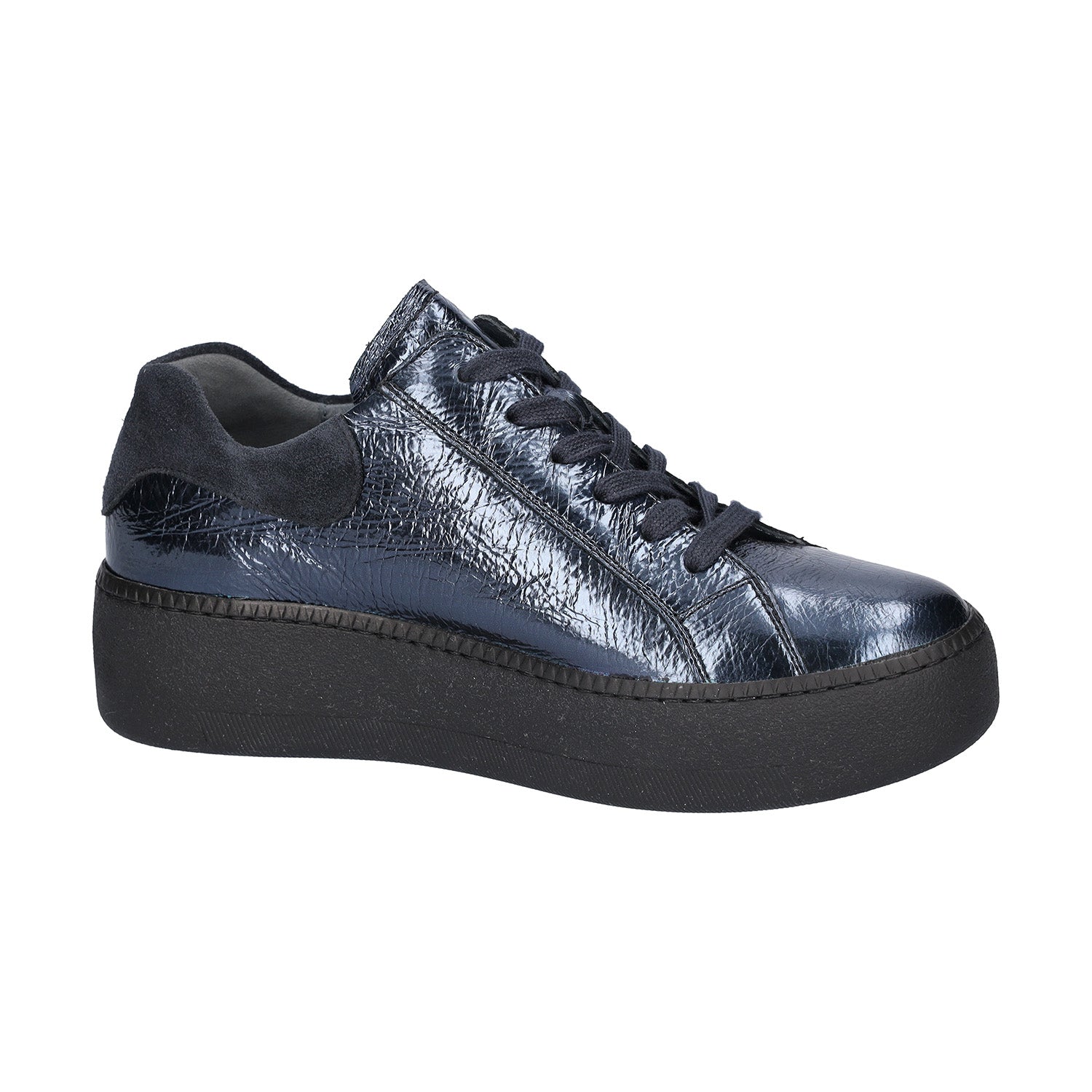 Navy metallic patent leather wider fitting sneakers with platform sole and navy suede heel trim. These dressed up sneakers are made in a soft blue metallic high shine patent leather which makes them soft and comfortable without needing to break them in.