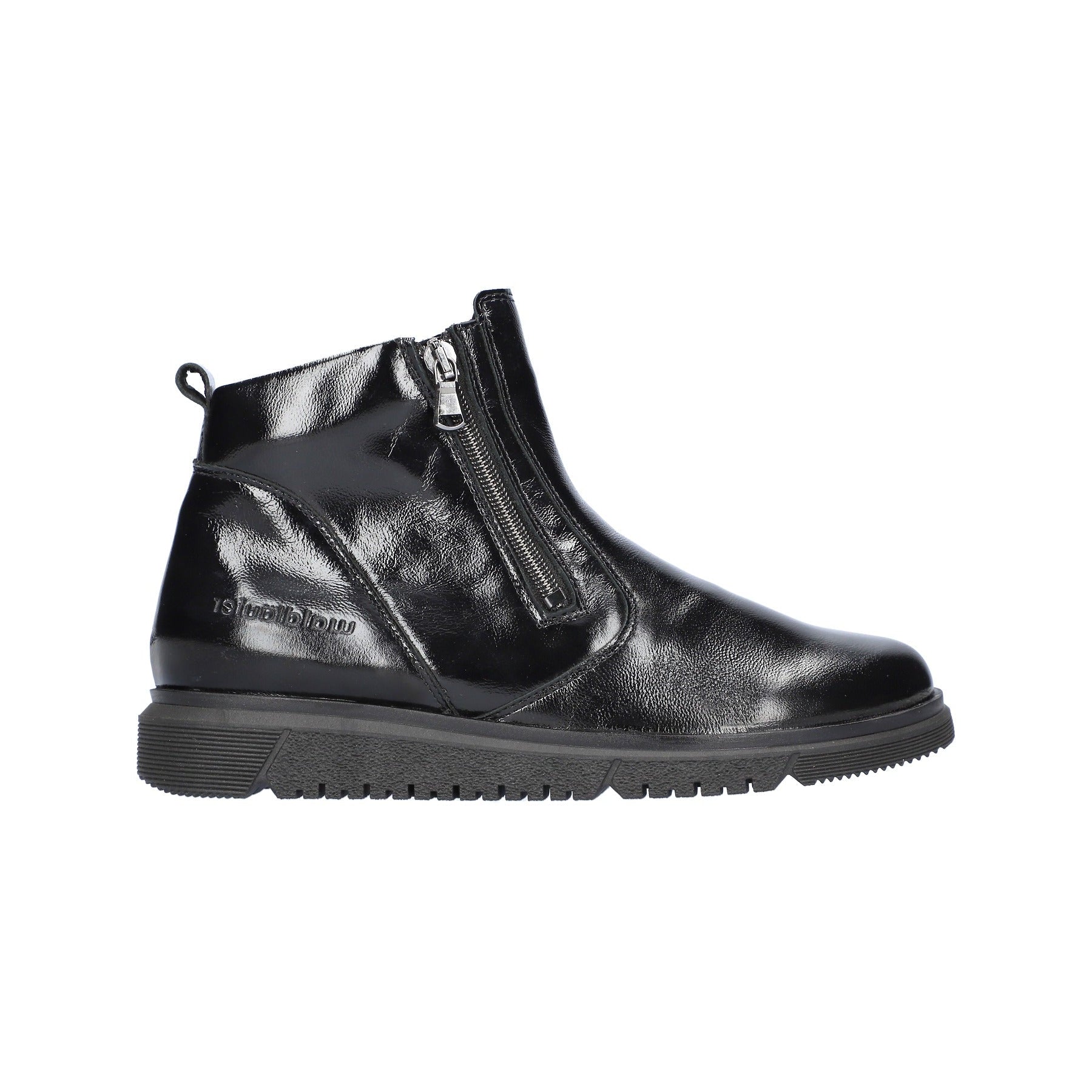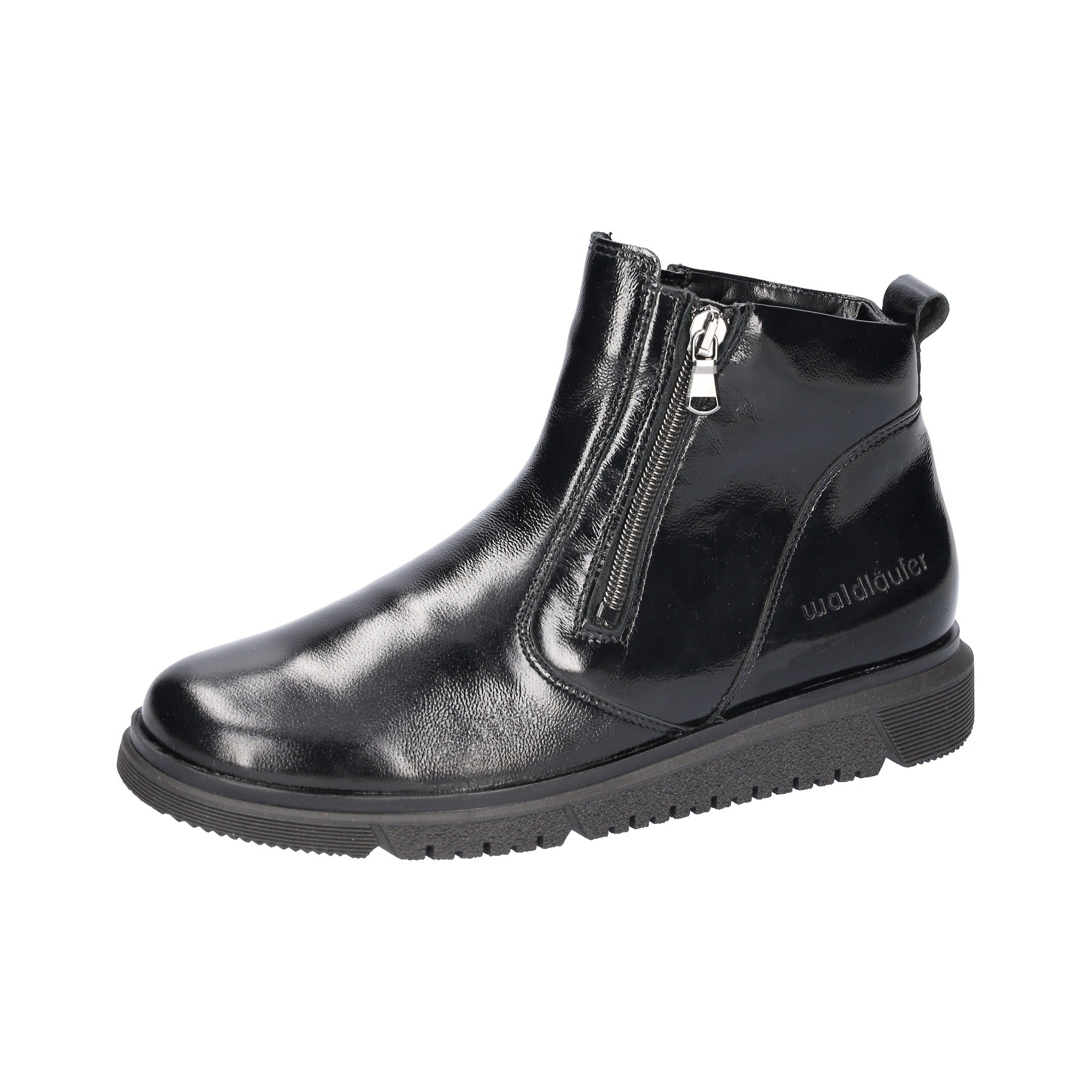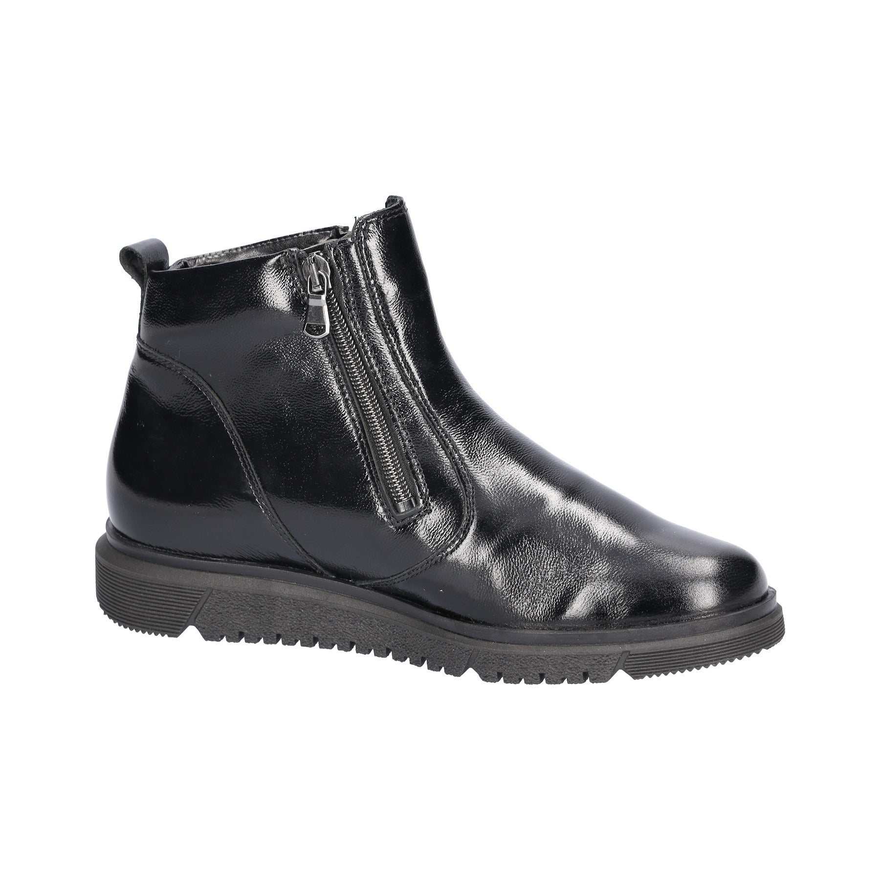 Waldlaufer H-Gesa patent leather twin zip ankle boots. These double zip boots are a breeze to put on and off and the fron tongue can open right out. All together this is a very comfortable wide fitting boot that is easy to get on with a lightweight and flexible outer sole with grip.
