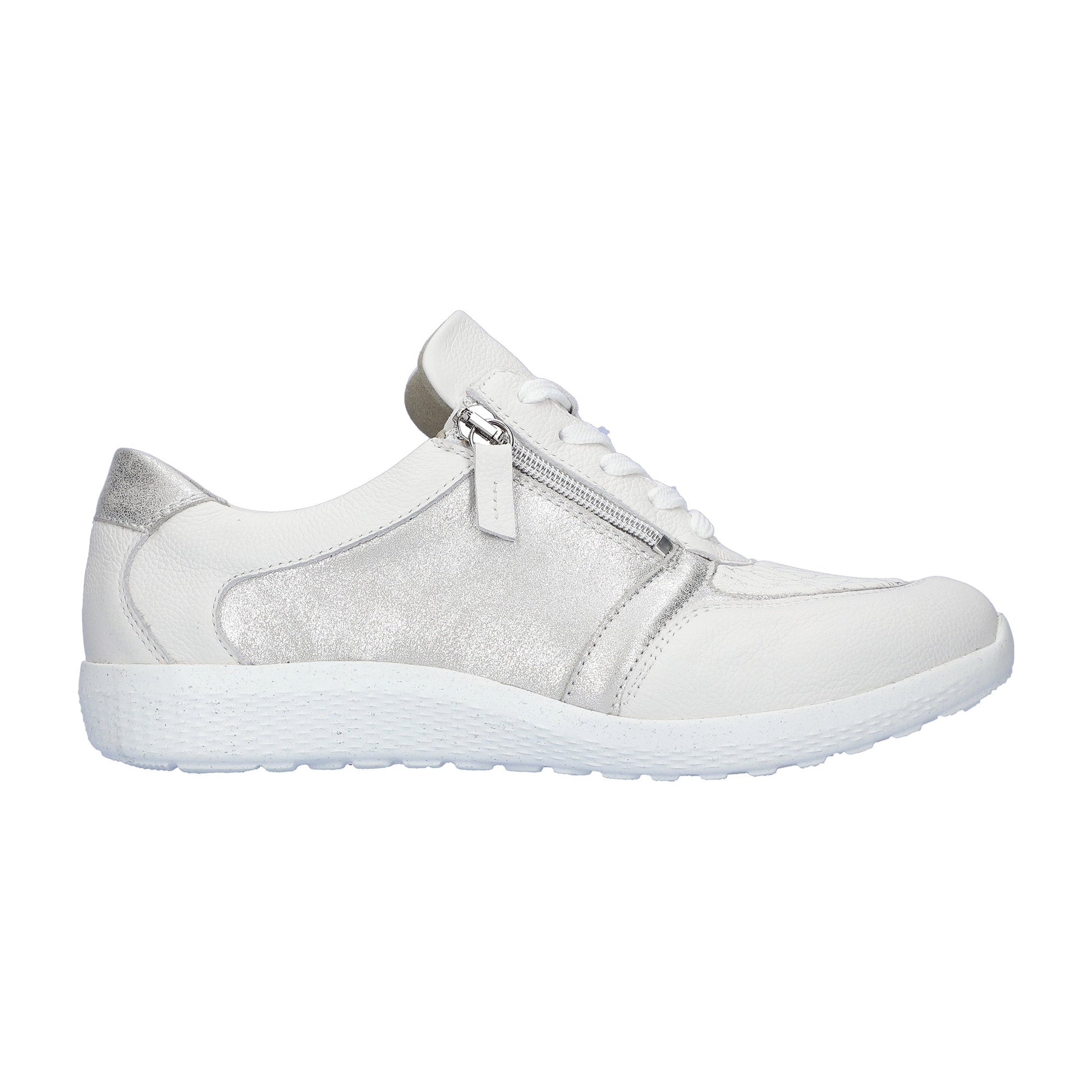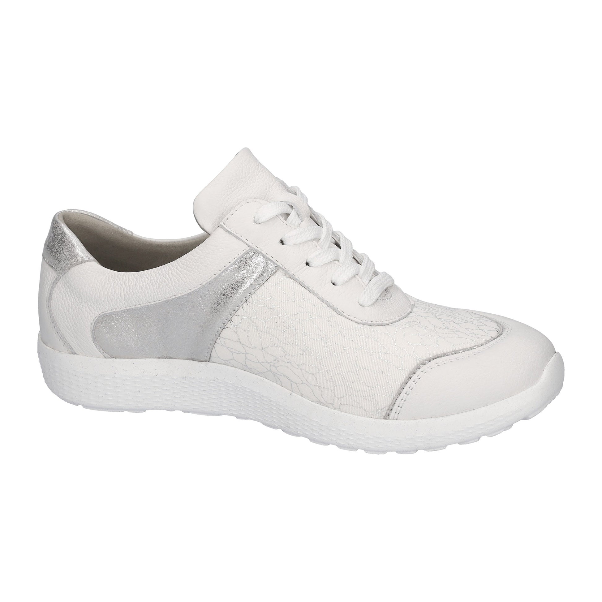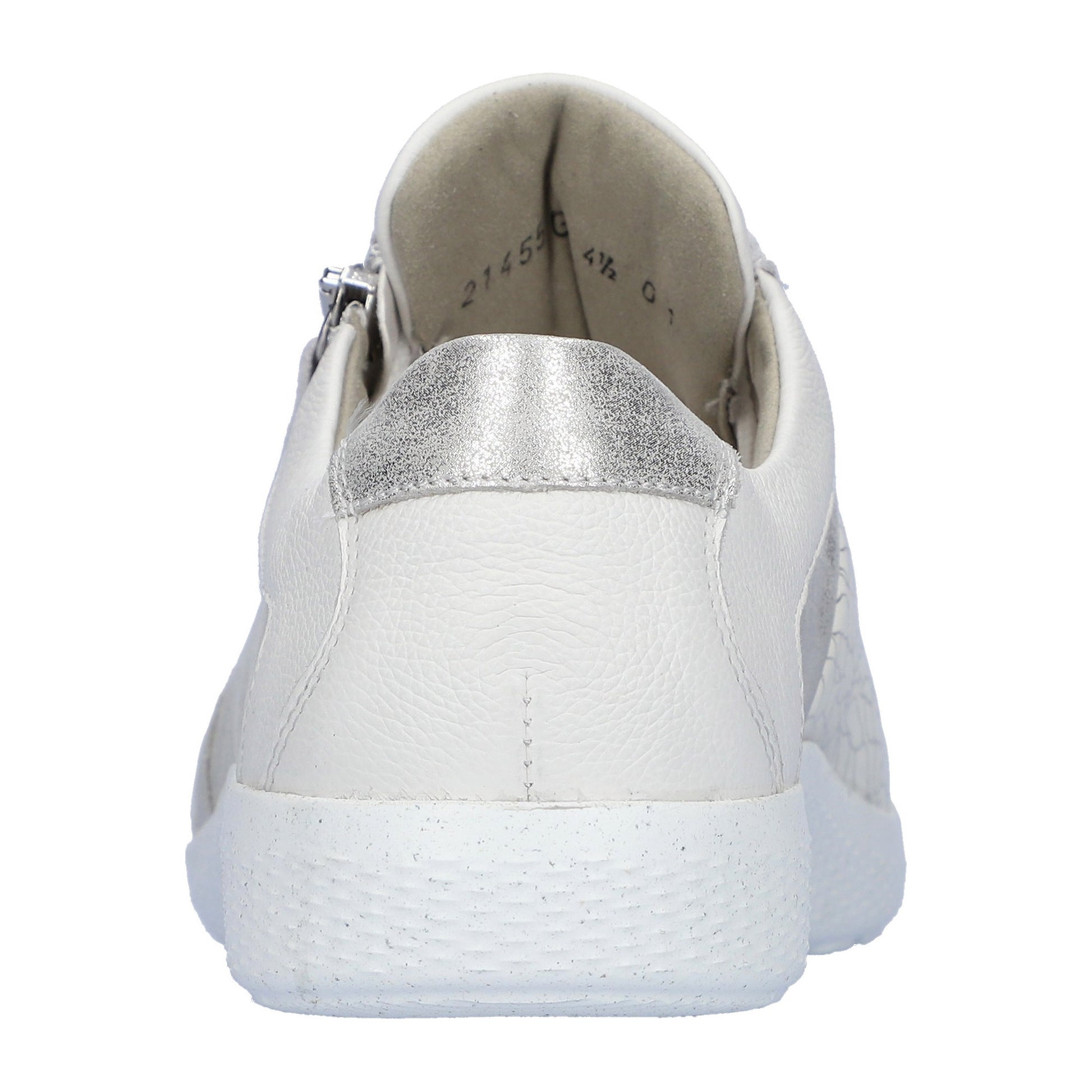 - White leather upper with stretchy silver patterned fabric toe area and silver leather side panel and trims.
