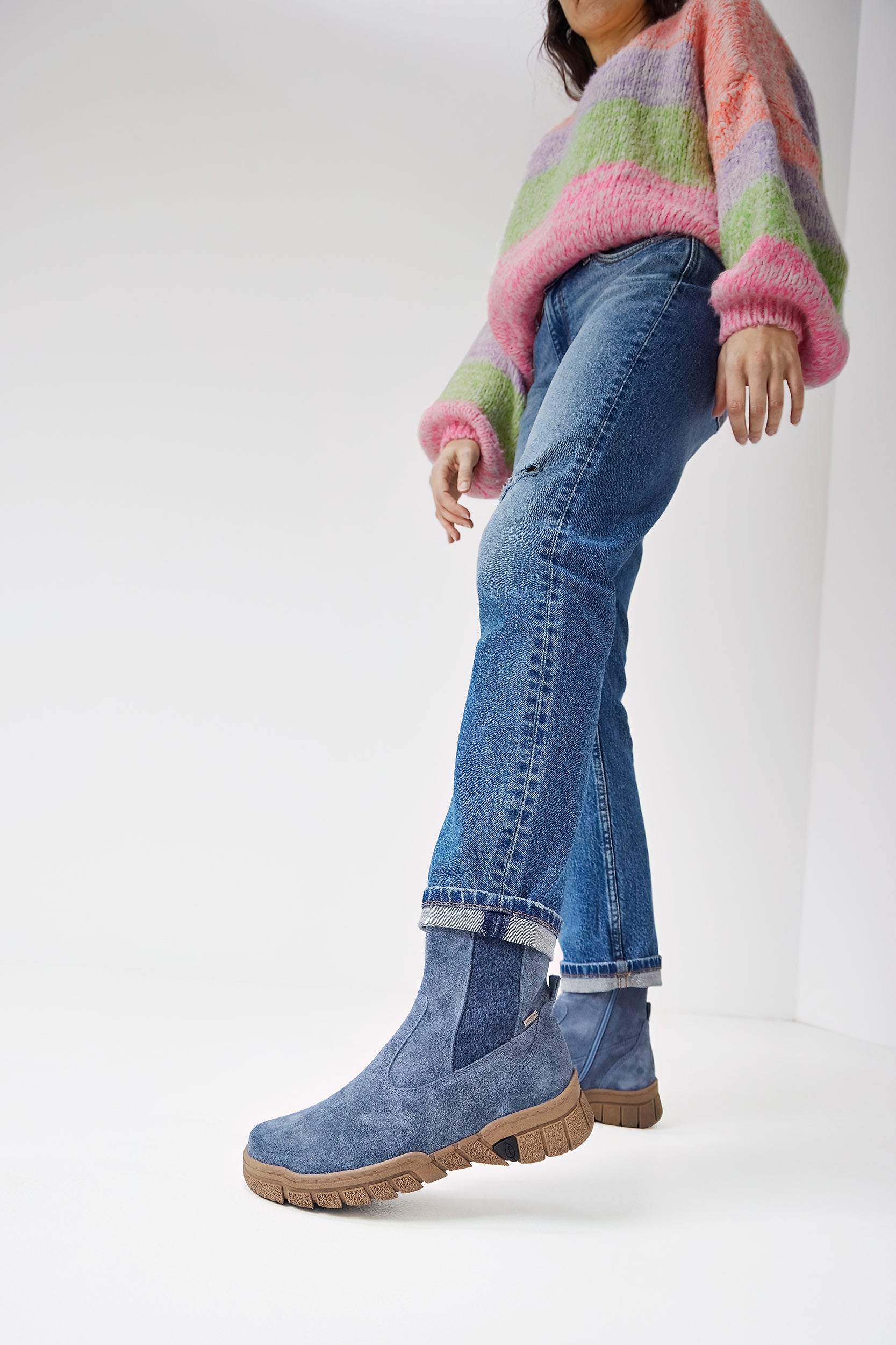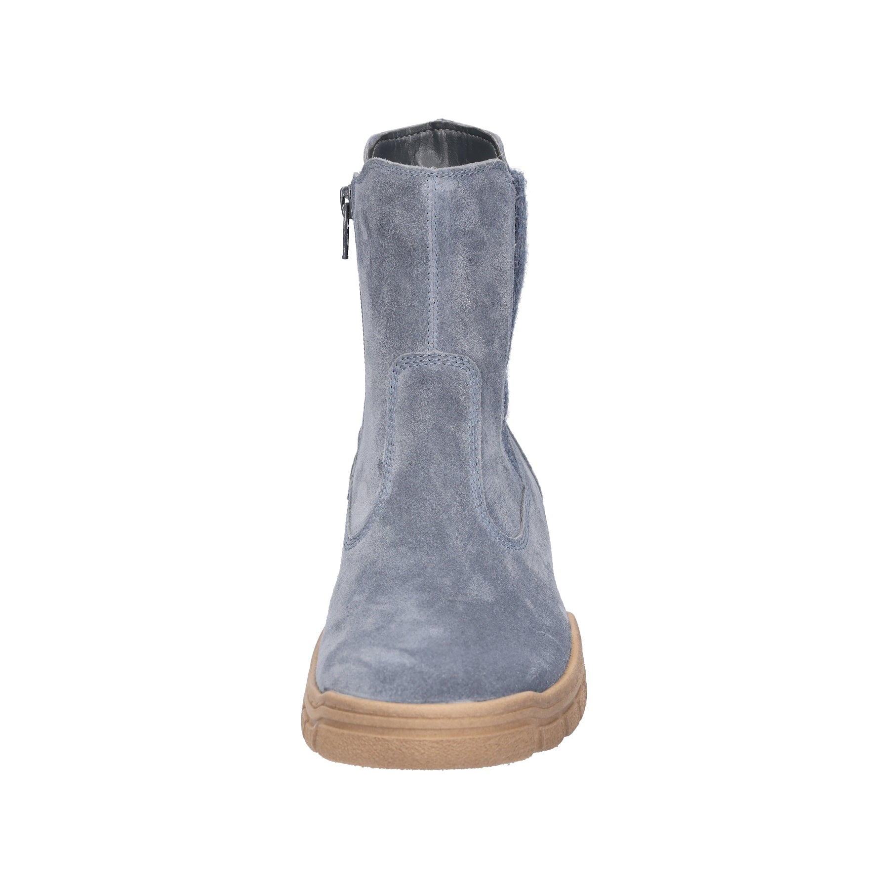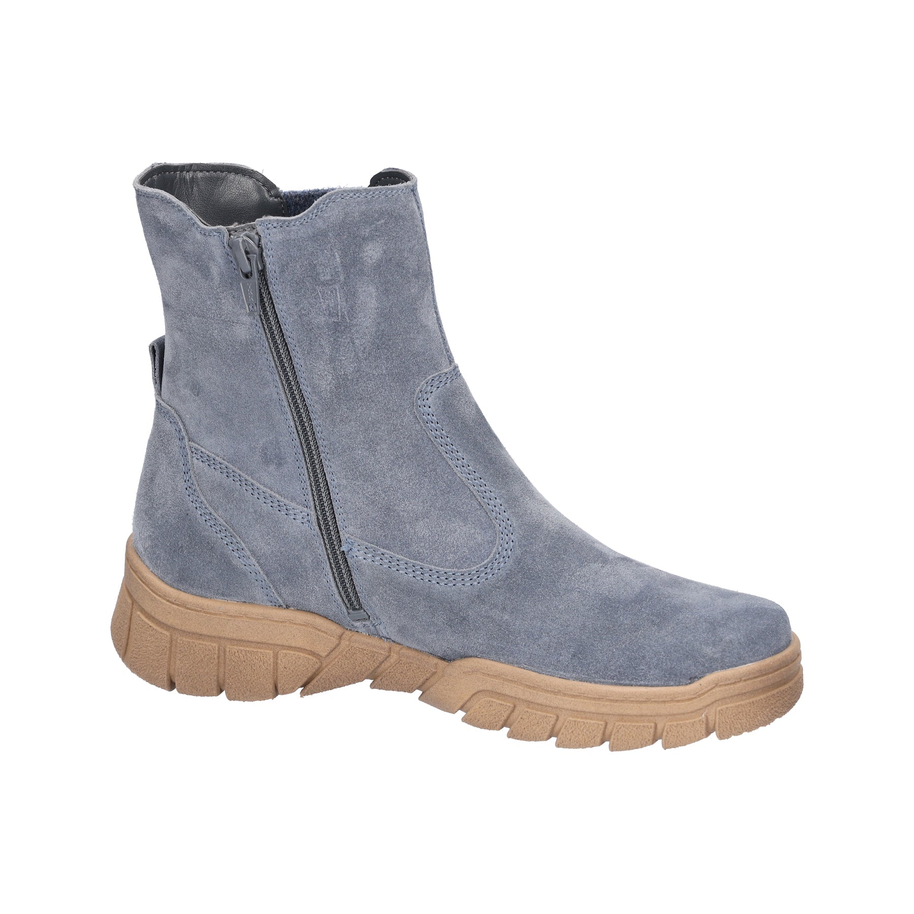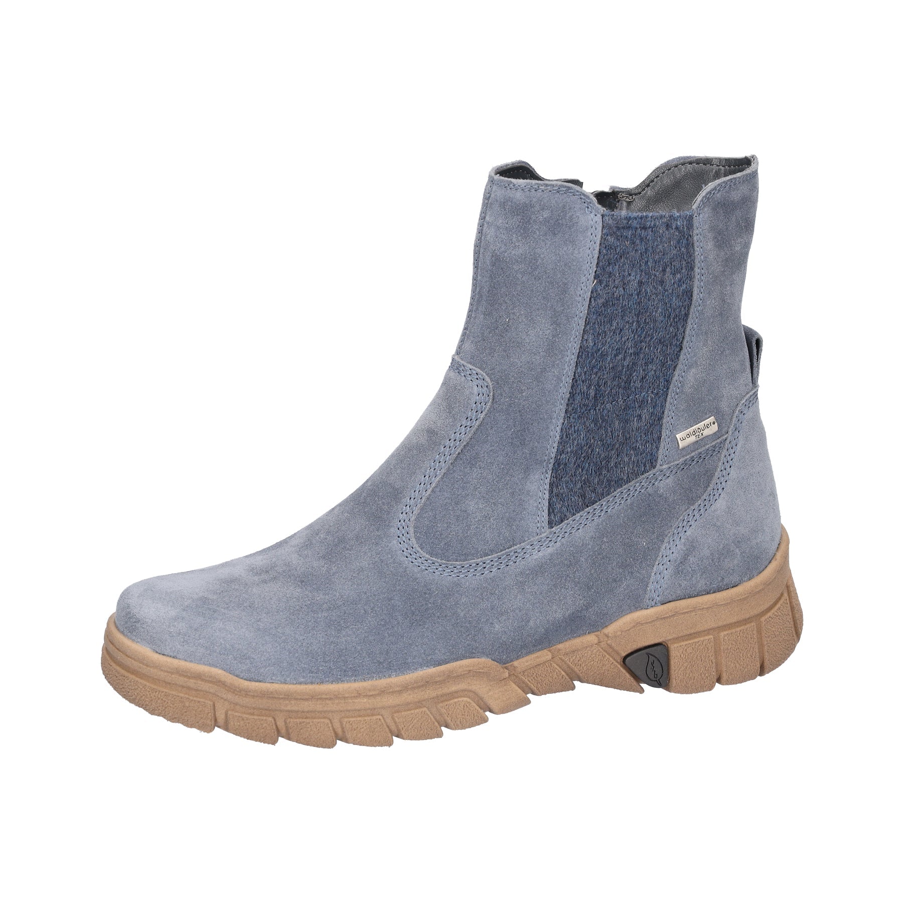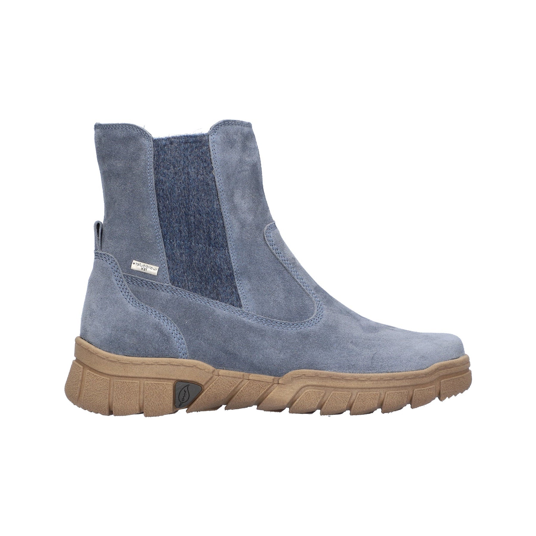 Super soft denim blue suede leather ankle boots with water resistant membrane and warm lightweight fleecy lining.