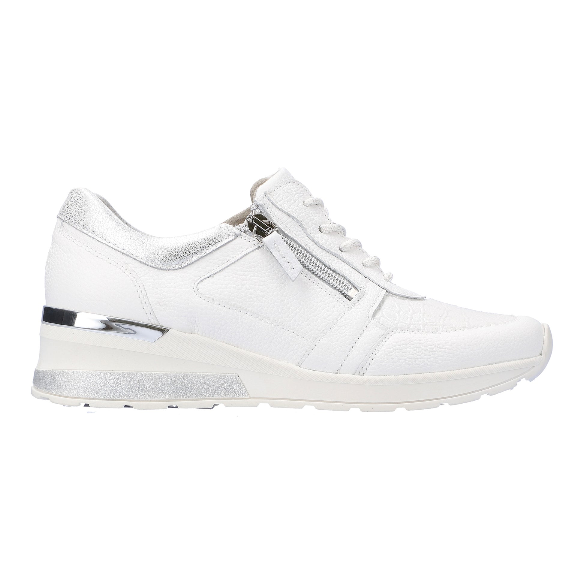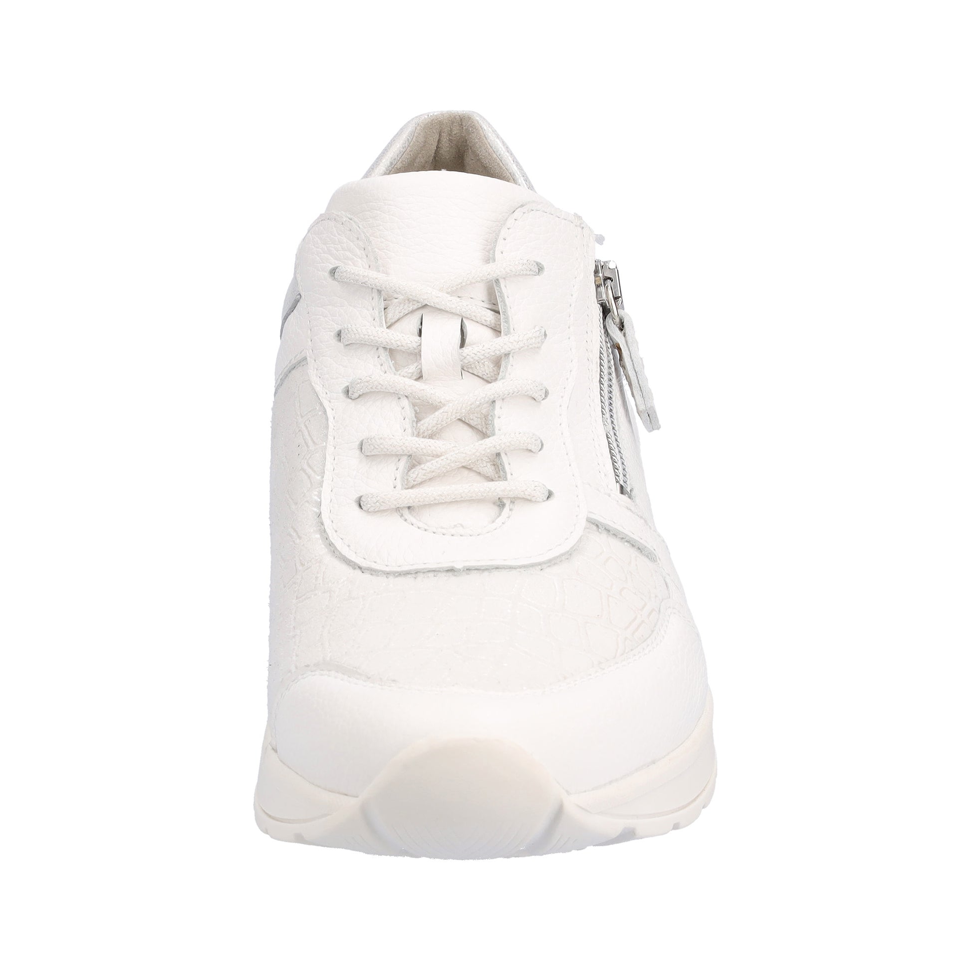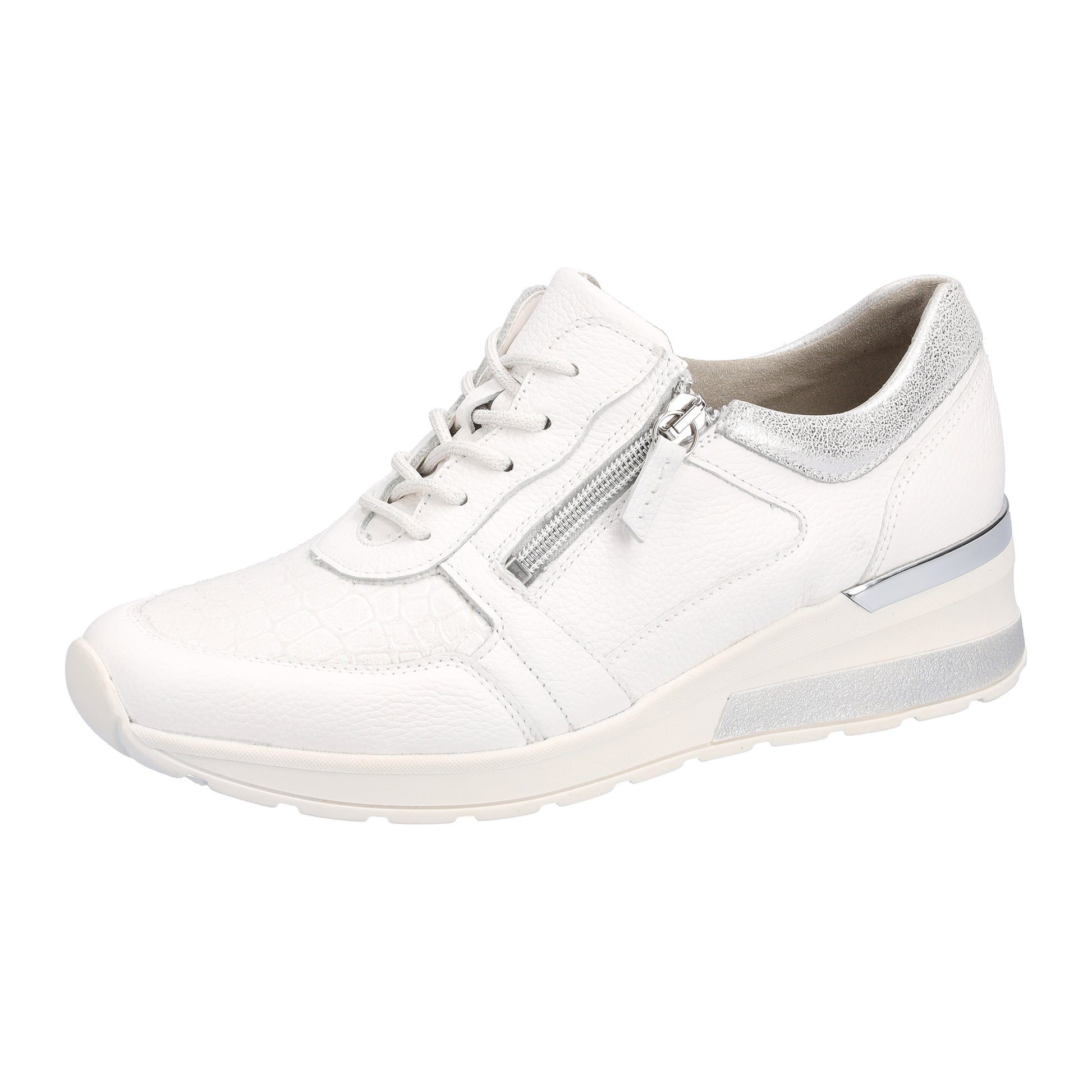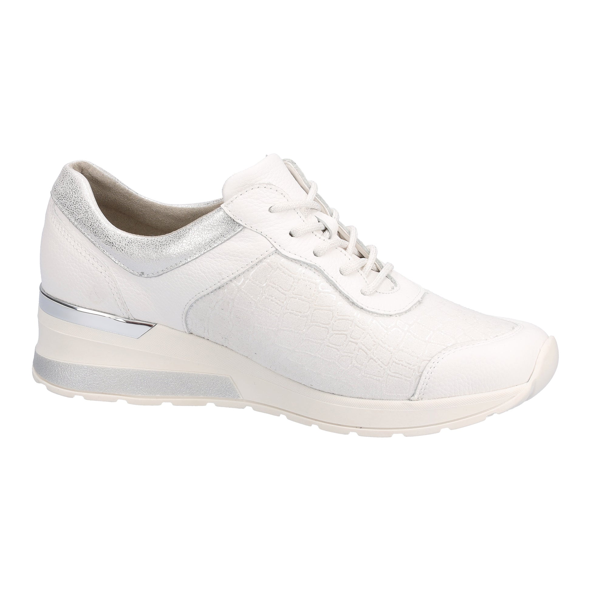 Soft white leather wedge heel trainer shoes with lace up front and side zip. The apron front is made from a soft stretch panel, the side trim is a combination of smooth leather and a metallic silver finish leather around the heel. Waldlaufer love to make good use of unusual leather types bringing a dressy look to a comfy pair of everyday shoes.
