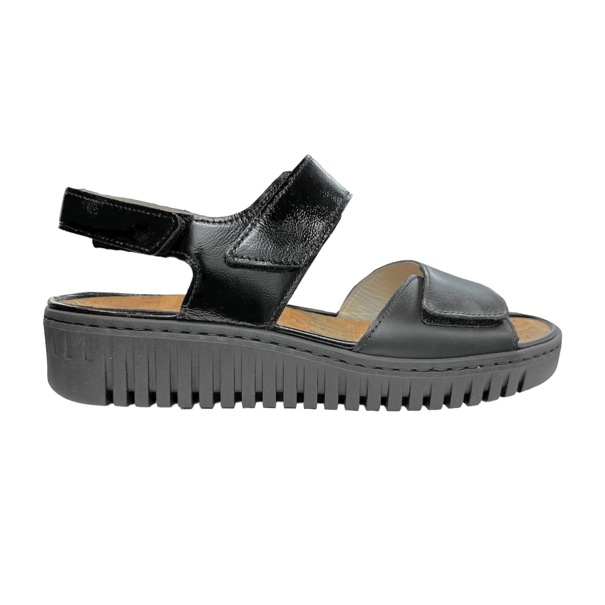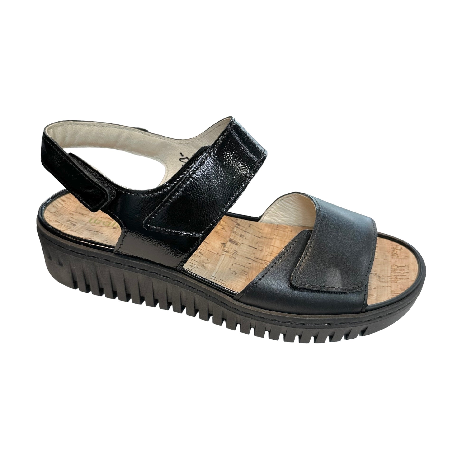 Waldlaufer soft black patent with lower strap in soft smooth black leather adjustable straps and cushioned natural cork insole. H-Willow, features a thicker sole than other sling back sandals for maximum cushioning. The heel strap is gently padded for extra comfort and is also an adjustable hook and loop fastening .