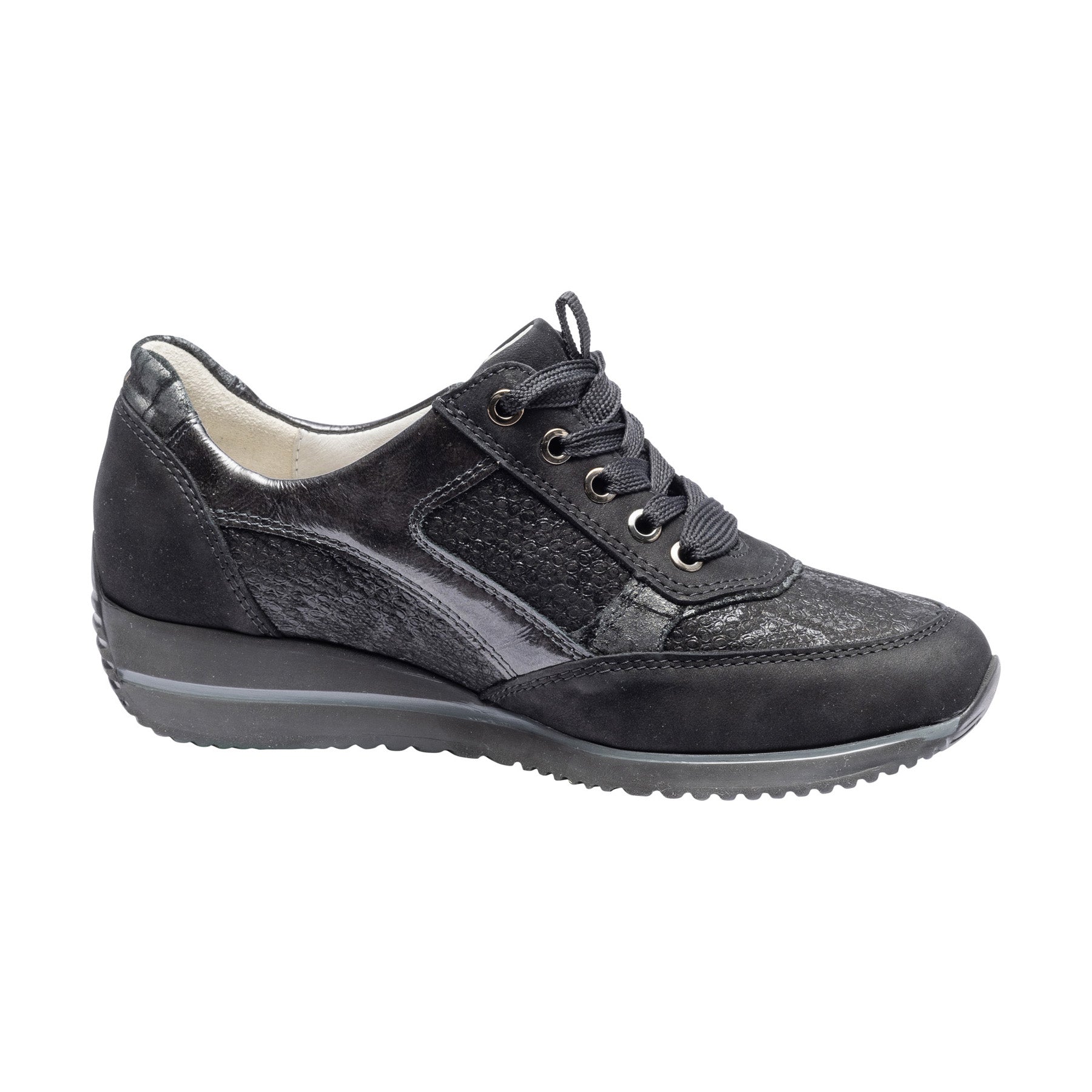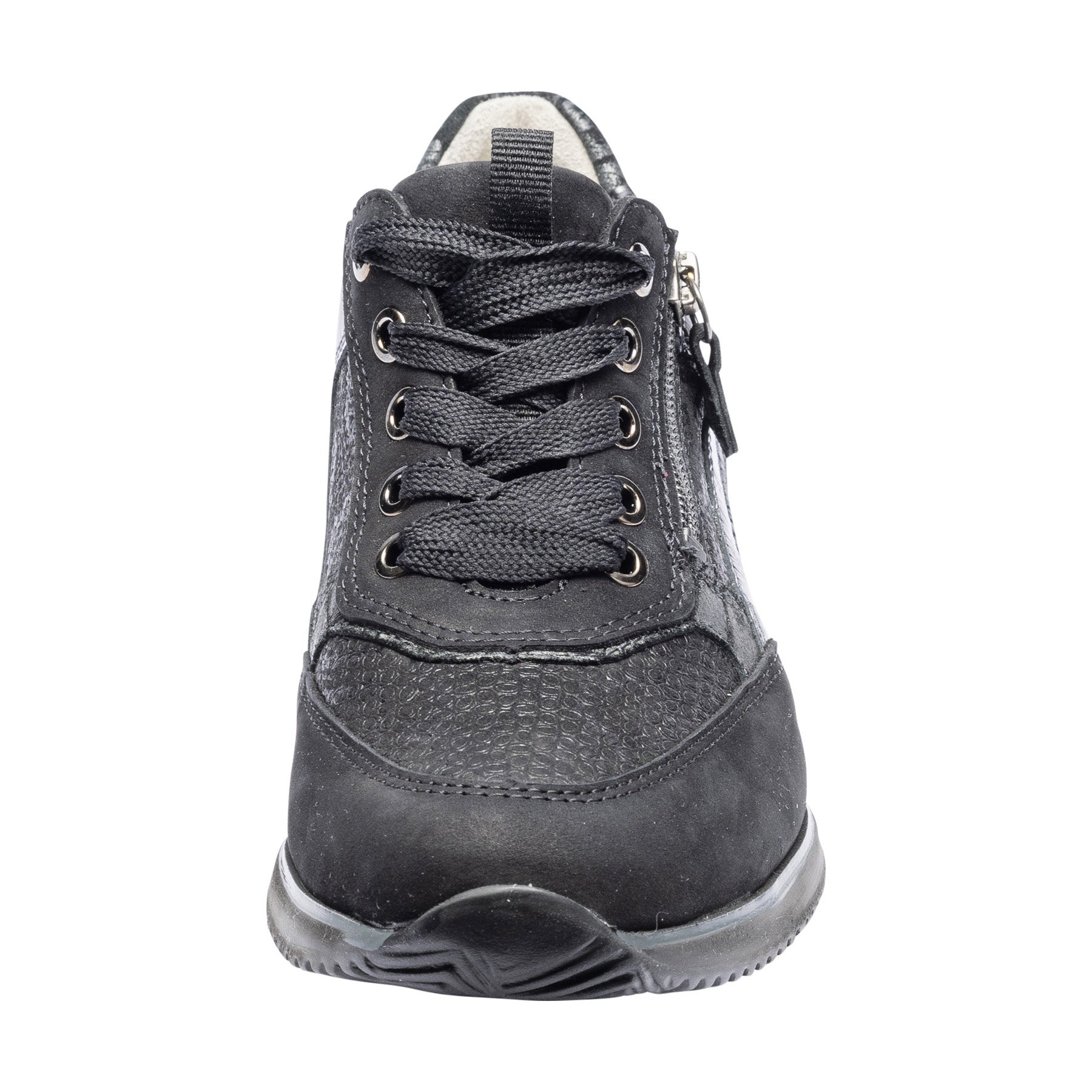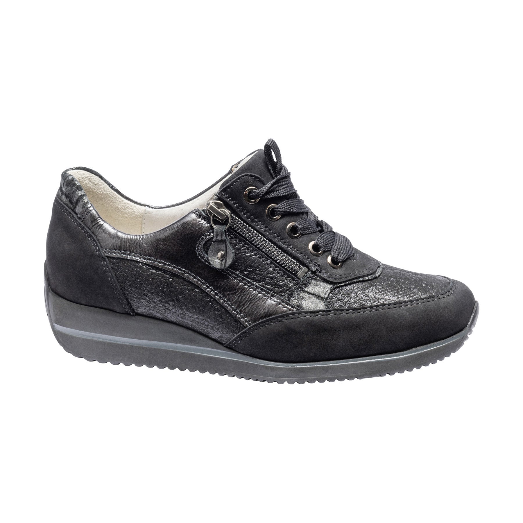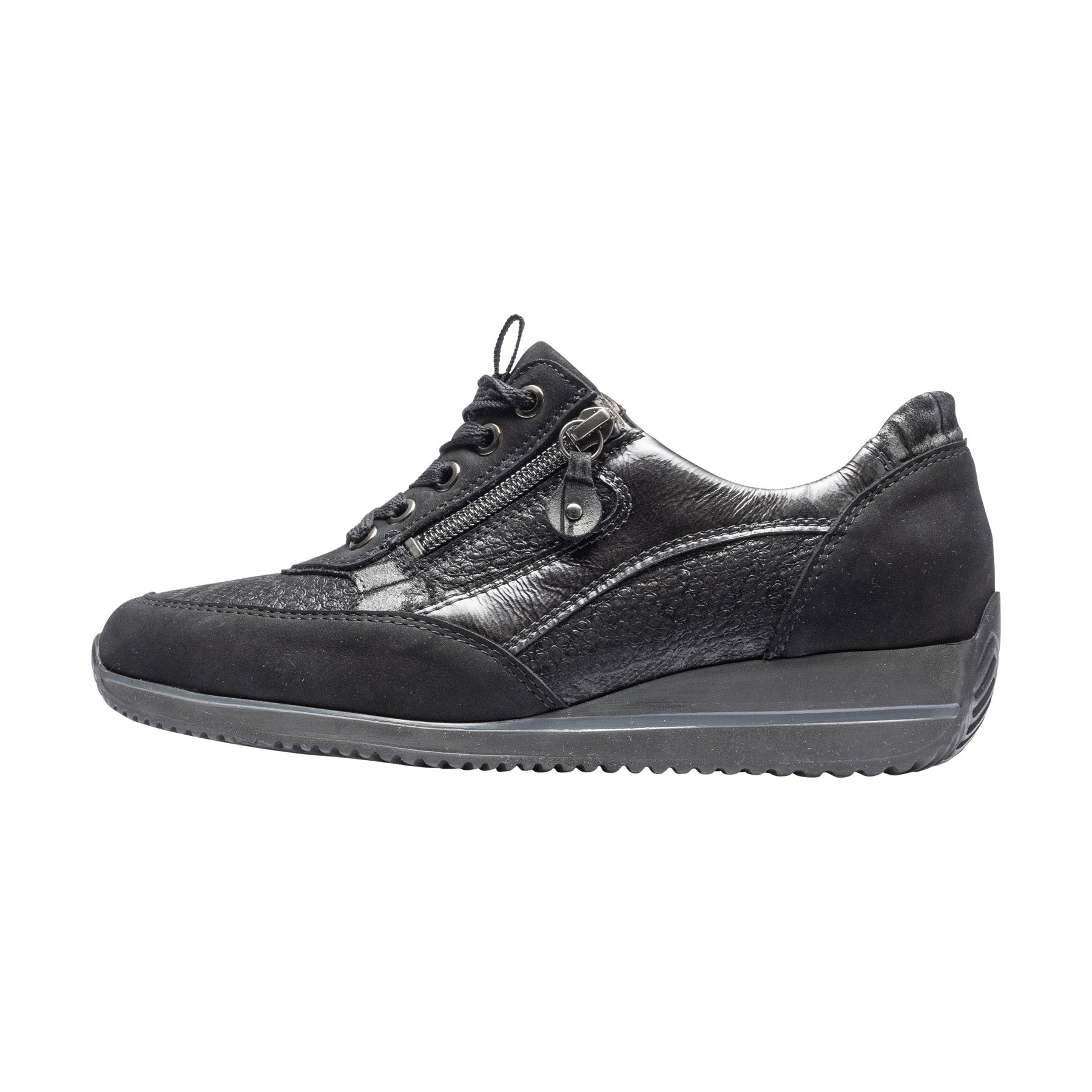 Light weight wide fit leather trainers with zip fastening in black suede leather with dressy snake print leather top. These smart lace up shoes are smarter than a regular pair trainers and incredibly light due to the EVA sole unit.