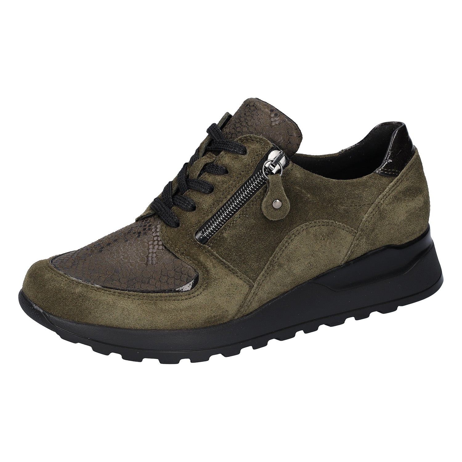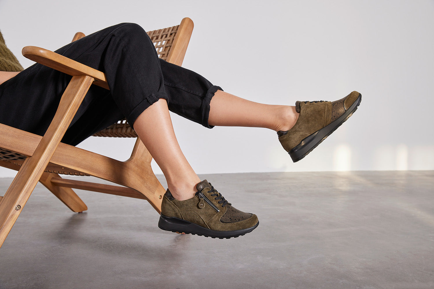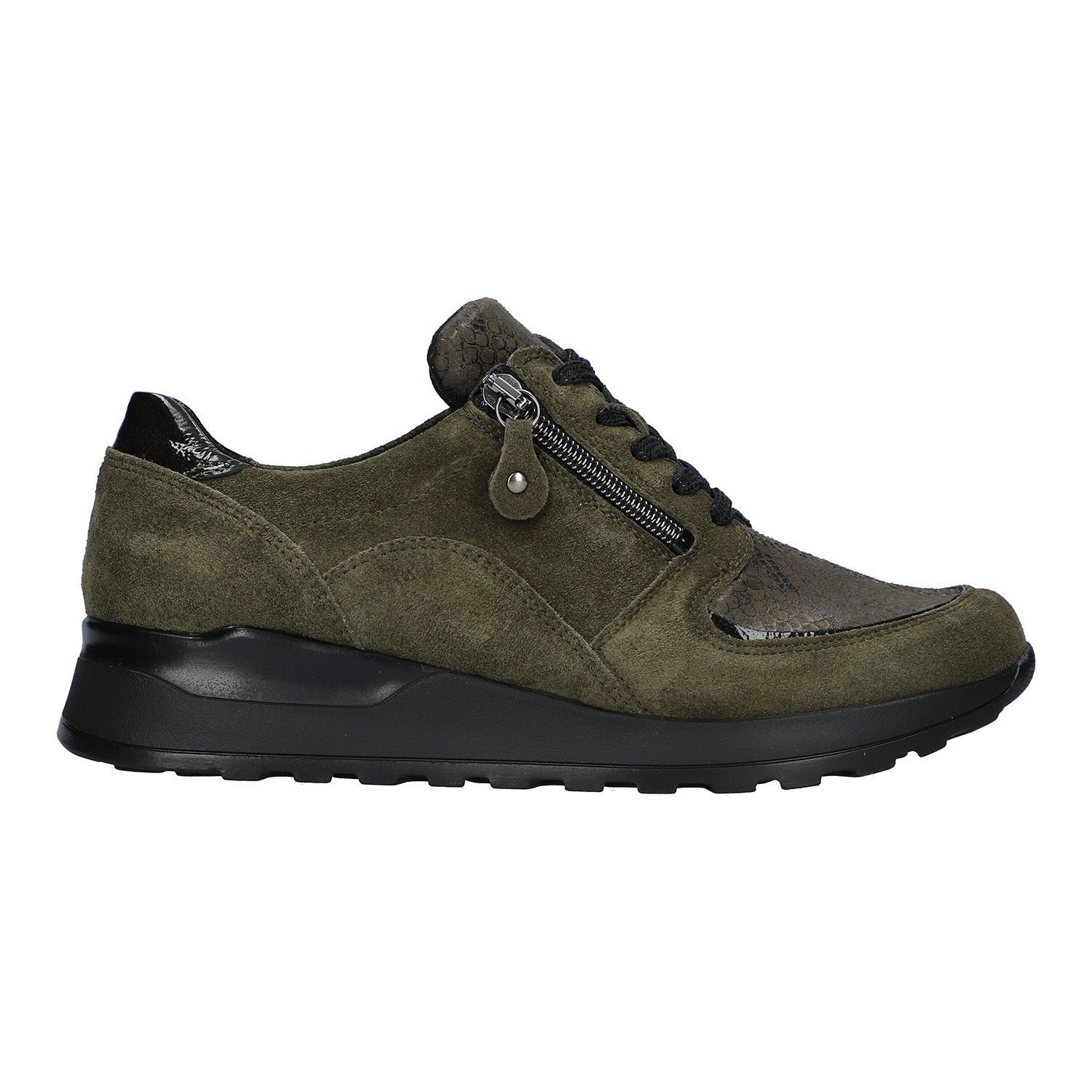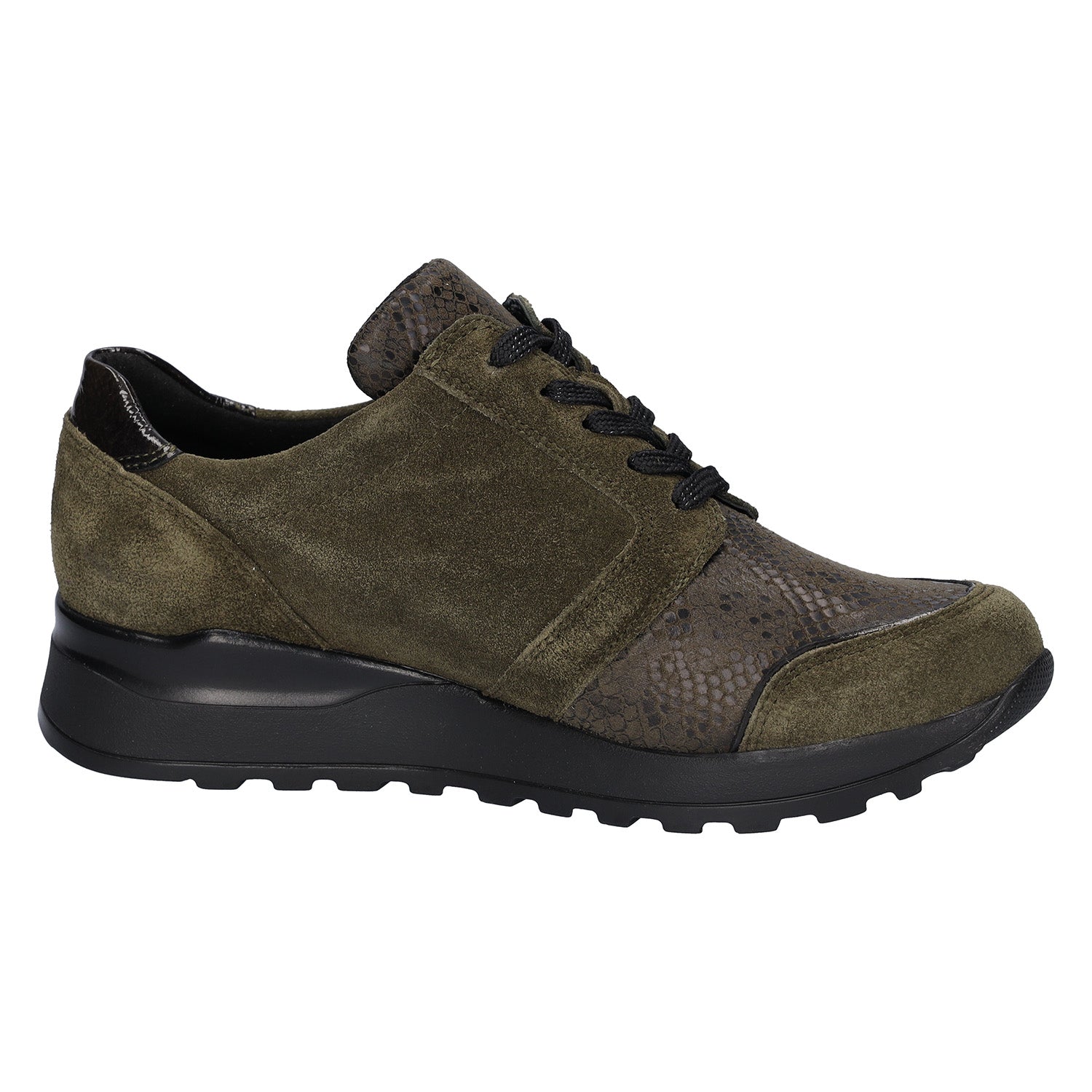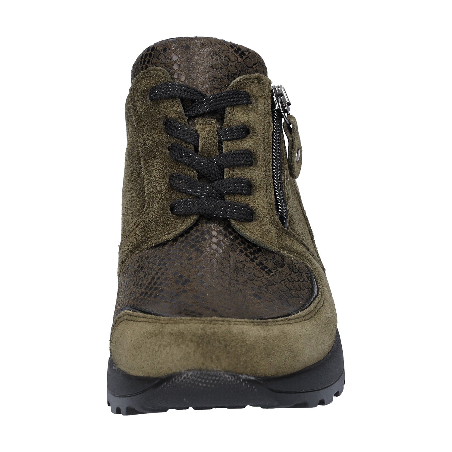 Waldlaufer Hiroko super soft khaki suede leather Extra Wide fit dressy trainers with lace up front and side zip. Hiroko has a super soft stretch fabric top which adapts to all different foot shapes.